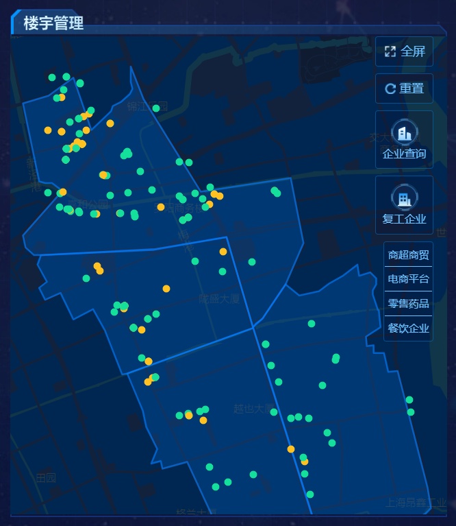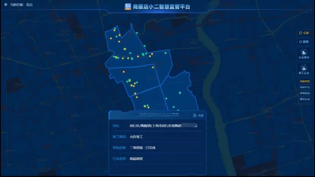 在梅陇镇“商服店小二”平台的“复工企业分类管理”模块“中,监管人员将分散的数据梳理成全景信息视图,构成辖区“画像”,其中“绿色”标注表示企业“复工复产申请已完成”,“黄色”标注表示企业“复工复产申请进行中”。通过不同的颜色标识,可以清晰感受不同商圈楼宇内的商业复苏情况。
