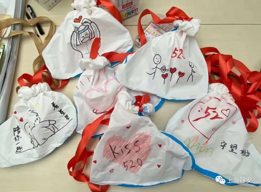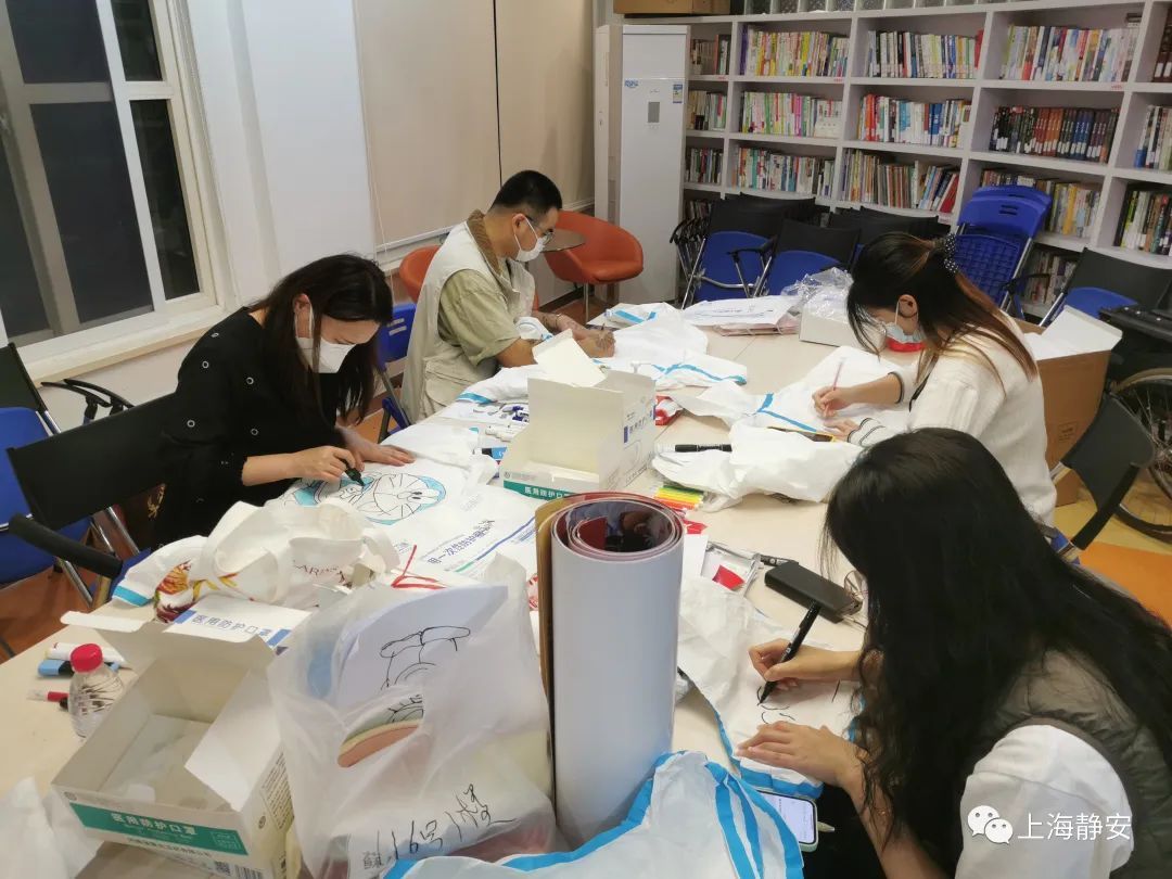 几天前,新福康里居民区党总支副书记朱新月和下沉到社区的临时党支部书记鲍玲红两人一拍即合,准备给采样现场的志愿者制造一份惊喜。提出这个想法后,很快就有其他志愿者主动加入,成立了一个临时美术小组。