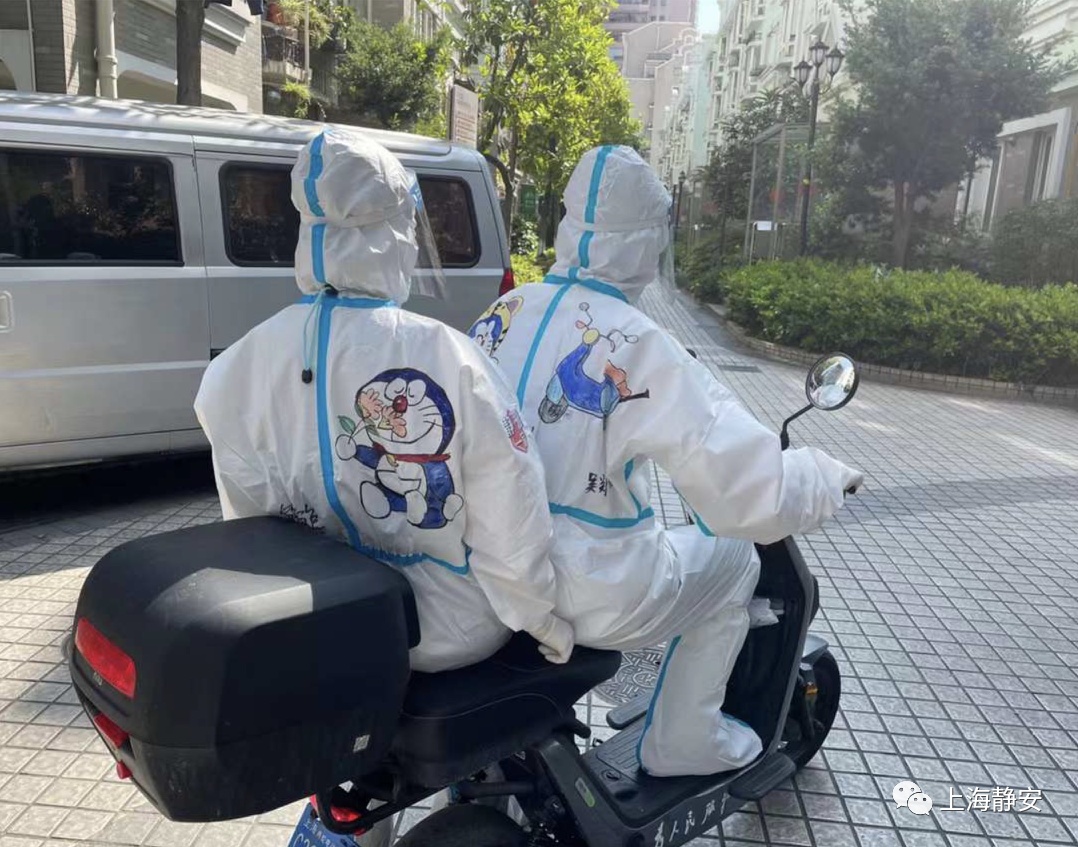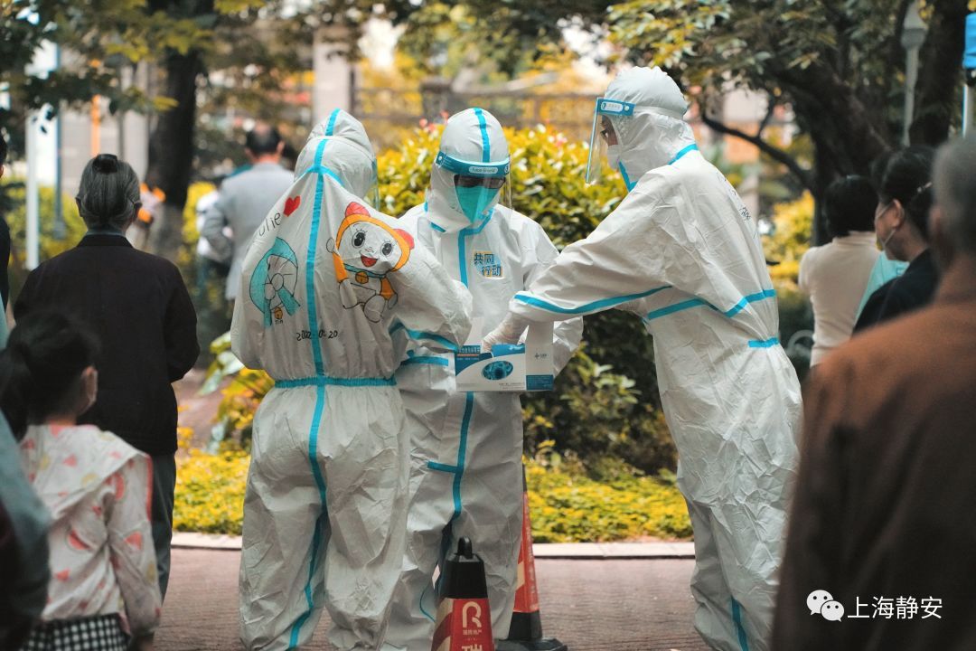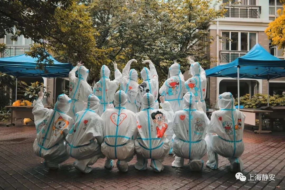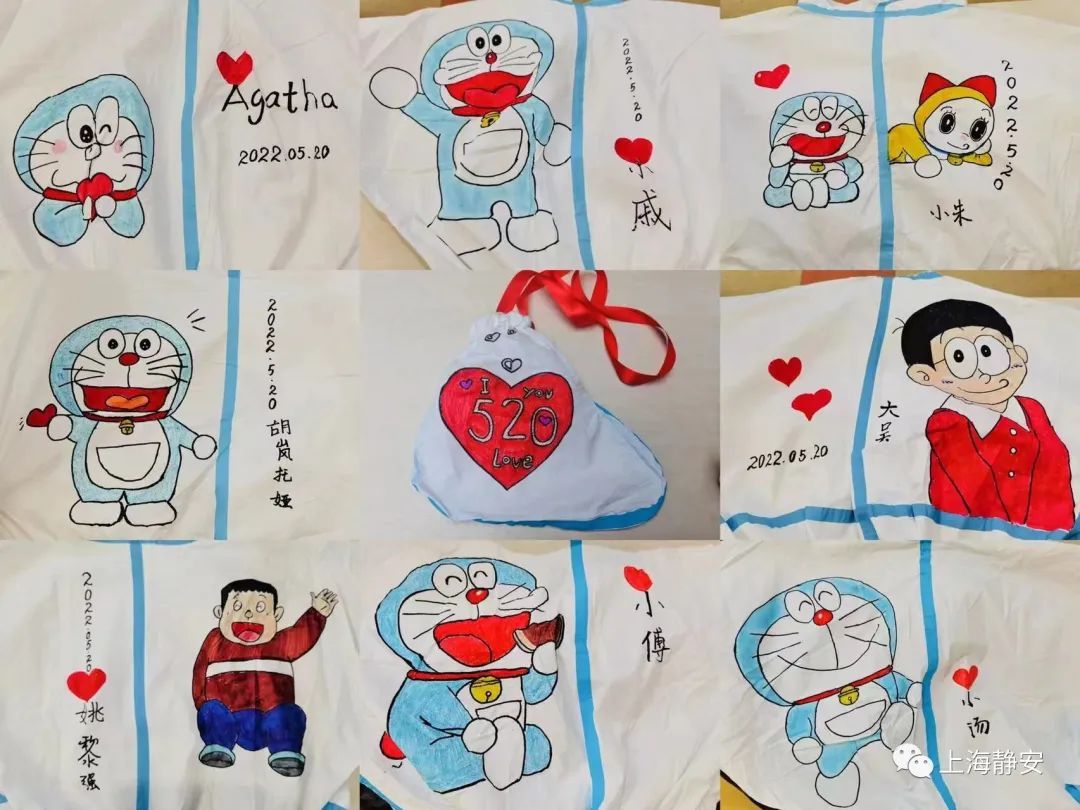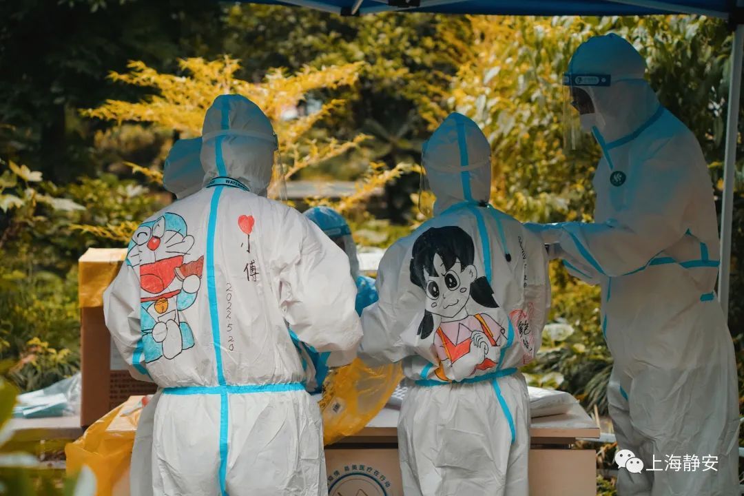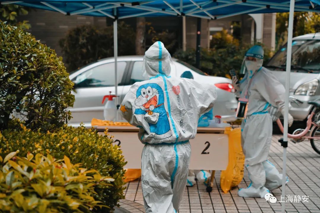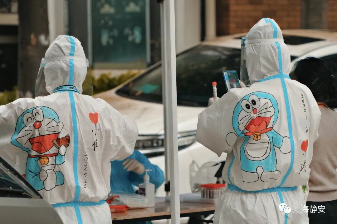 5月20日上午,石门二路街道新福康里居民区有序开展全员核酸筛查,细心的居民发现,今天核酸采样现场的“大白”和平常有些不同,他们的防护服背后多了各式各样的机器猫等可爱的卡通形象,吸引了不少居民、小朋友的目光。