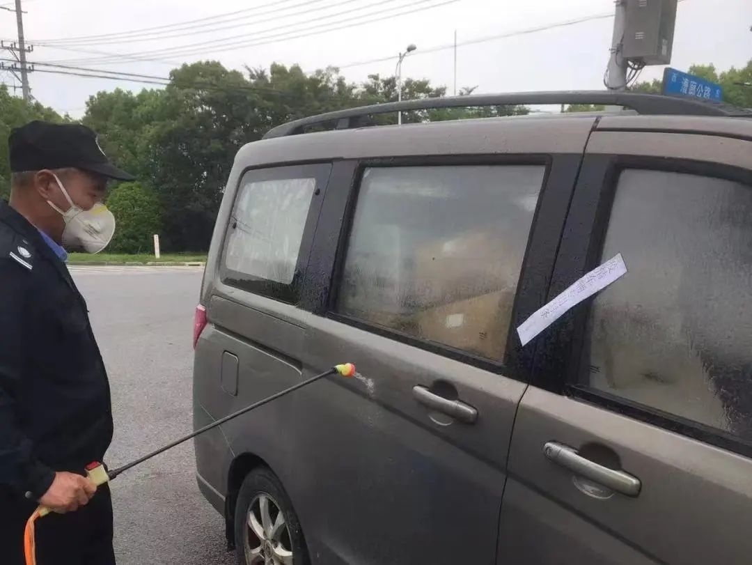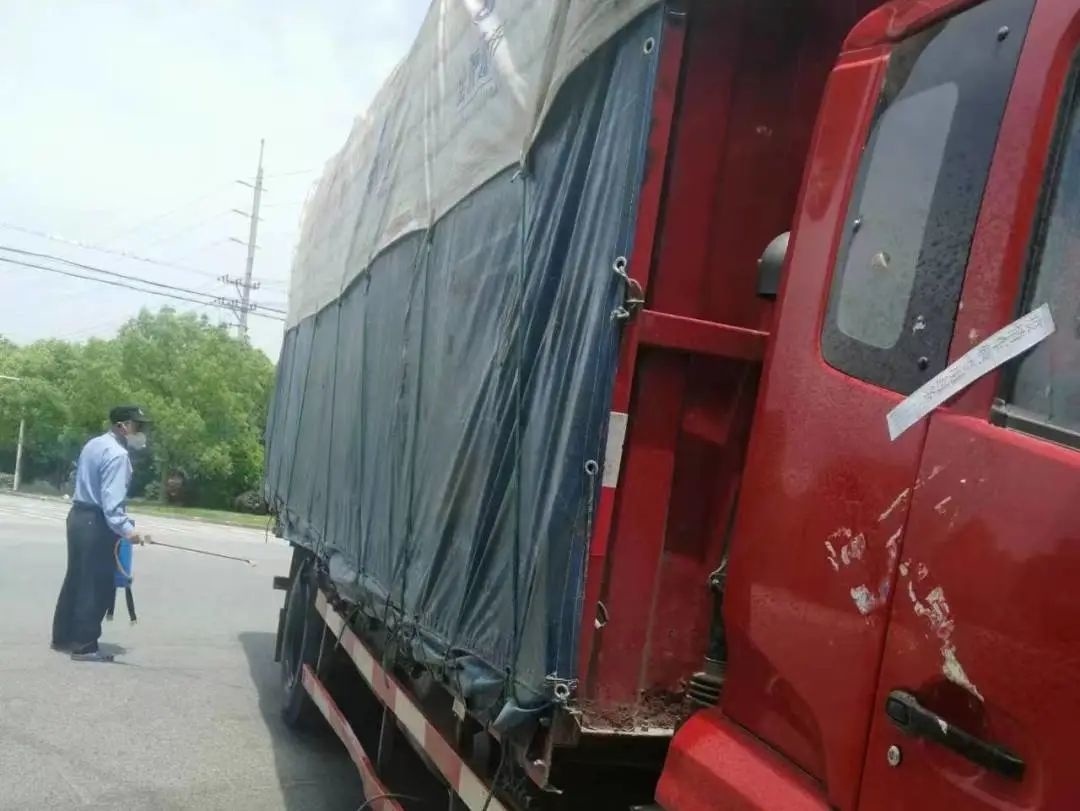 待所有查验合格后,车辆就会被贴上专属封条,在确认好司机不能下车,由工作人员引导车辆在指定位置——交换缓冲区等待,进行第二轮的全车消杀。