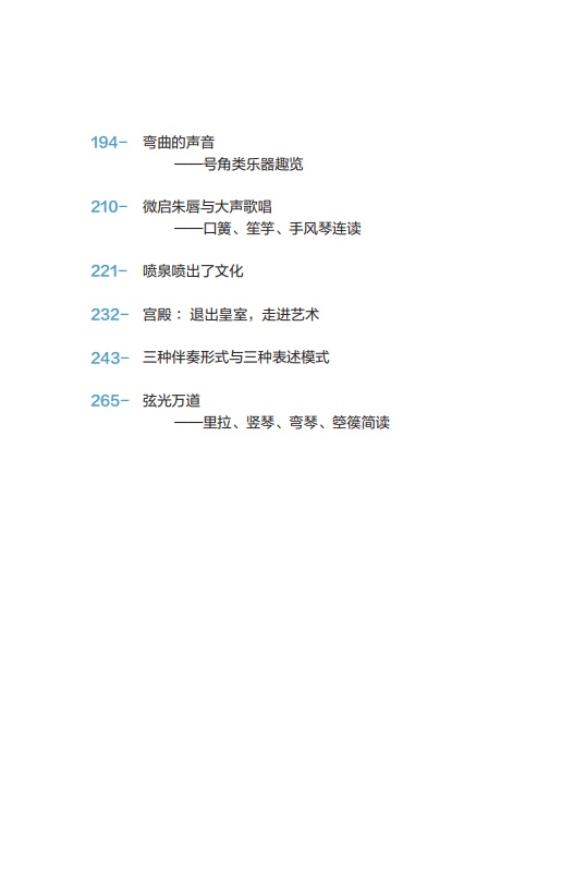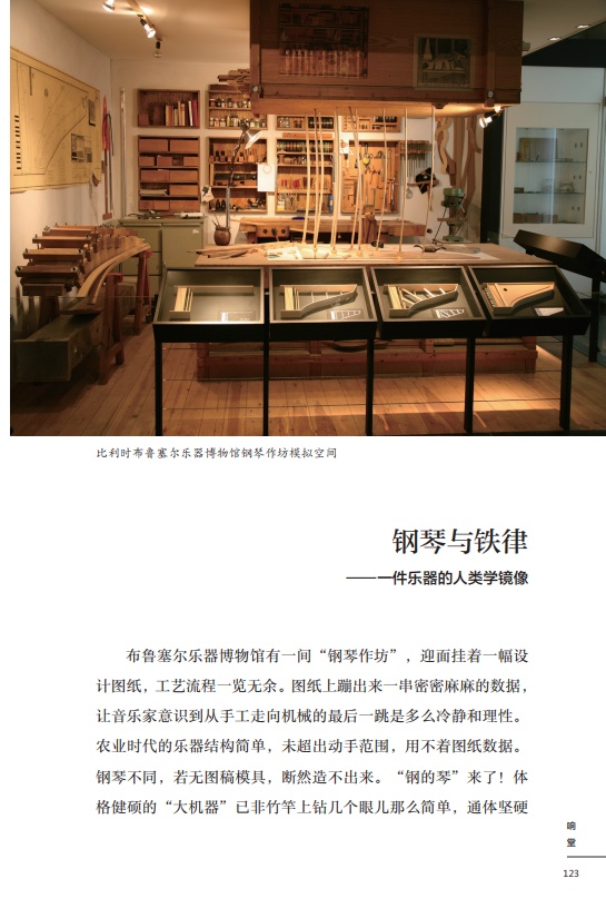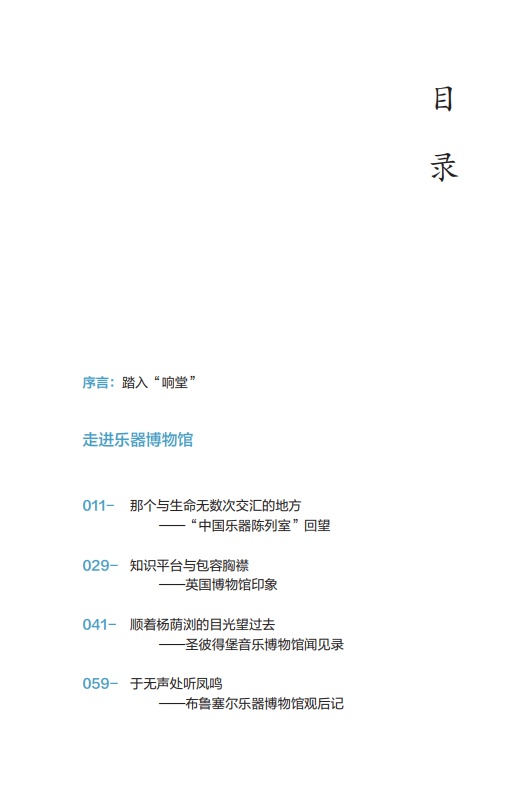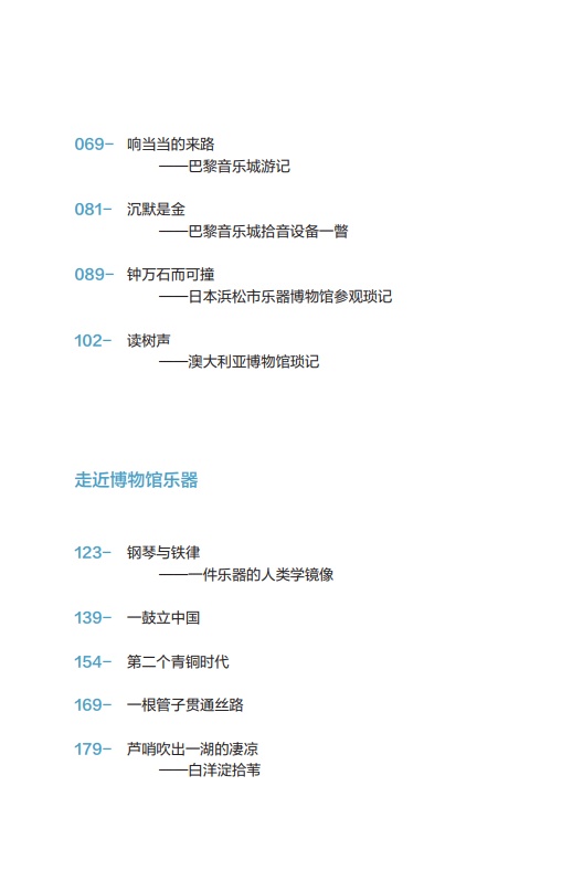 全书分为两部分,共19篇文章:第一部分“走进乐器博物馆”,参观博物馆,记述参观各音乐博物馆印象,如中国第一家“中国乐器陈列室”、法国巴黎音乐城以及英国伦敦大英博物馆等;第二部分“走近博物馆乐器”,乐器品鉴,其中有《钢琴与铁律——一件乐器的人类学镜像》《弦光万道——里拉、竖琴、箜篌简读》《一鼓立中国》《第二个青铜时代》等。