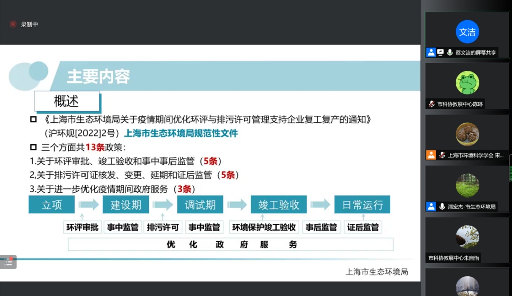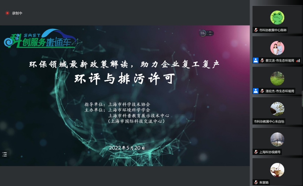 5月20日上午,“上海市科协科创服务直通车”疫情期间优化环评与排污许可管理政策解读专场圆满举办。在上海市科学技术协会和上海市生态环境局的指导下,本次活动由上海市环境科学学会和上海市科普教育展示技术中心(上海市国际科技交流中心)联合策划主办,通过腾讯会议、“上海科协”视频号同步直播,在线参与人数迅速突破1000人,反响热烈。