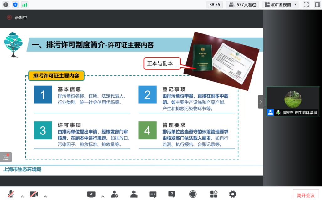 潘宏杰老师详细介绍了排污许可的改革进程、中央精神、法律体系、总体设计思路、分类管理、分级管理内容以及许可证的主要内容,深入解读了沪环规〔2022〕2号文中优化排污许可管理的5条政策,包括豁免抗疫保供项目的排污许可手续、拓宽“两证合一”试点实施范围、分类简化排污许可证变更形式、延长排污许可证有效期和优化排污许可证执行报告;重点聚焦本市环评和排污许可“两证合一”试点,结合《上海市生态环境局关于开展排污许可制与环境影响评价制度衔接改革试点工作的通知》(沪环评〔2022〕44号),对试点目标、试点范围、试点内容及办理途径等进行了详细讲解。