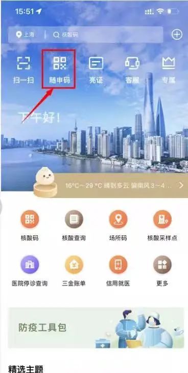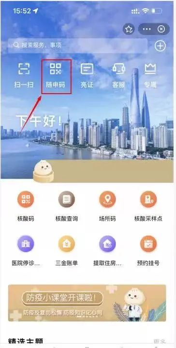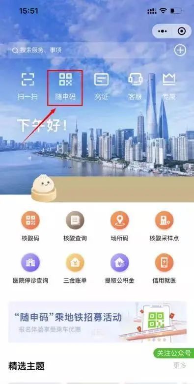 第一步:使用“随申办”APP或“随申办”微信、支付宝小程序,打开自己的“随申码”(二维码),或出示实体身份证