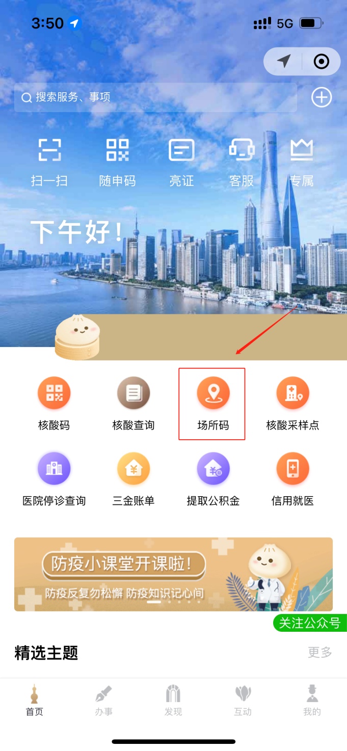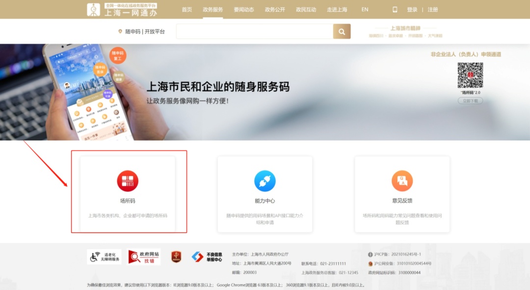 第一步:单位法人或授权经办人打开“随申办”APP或“随申办”微信、支付宝的小程序,通过首页热门服务“场所码”进入。