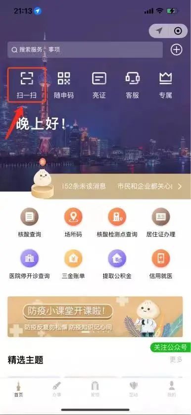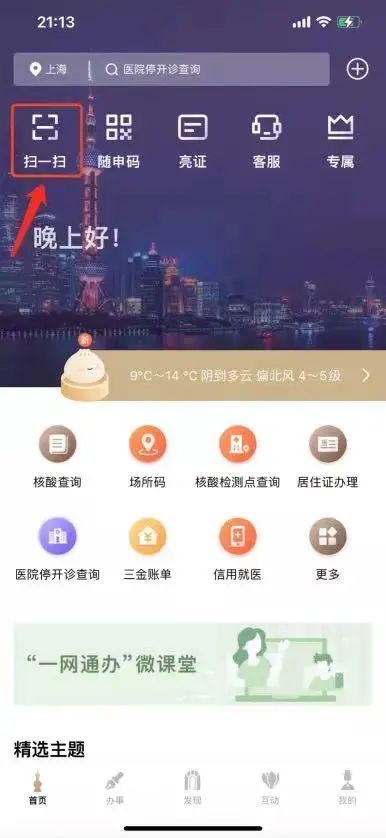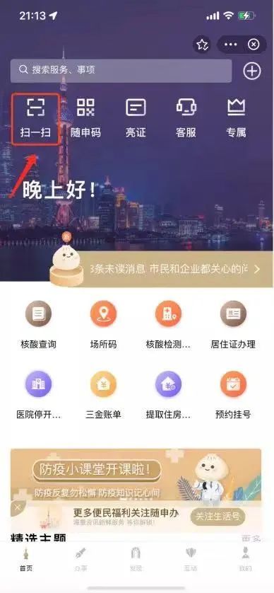 方法一:使用“随申办”APP或“随申办”微信、支付宝小程序的“扫一扫”功能