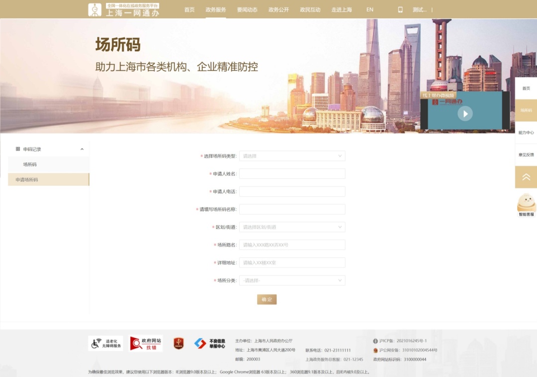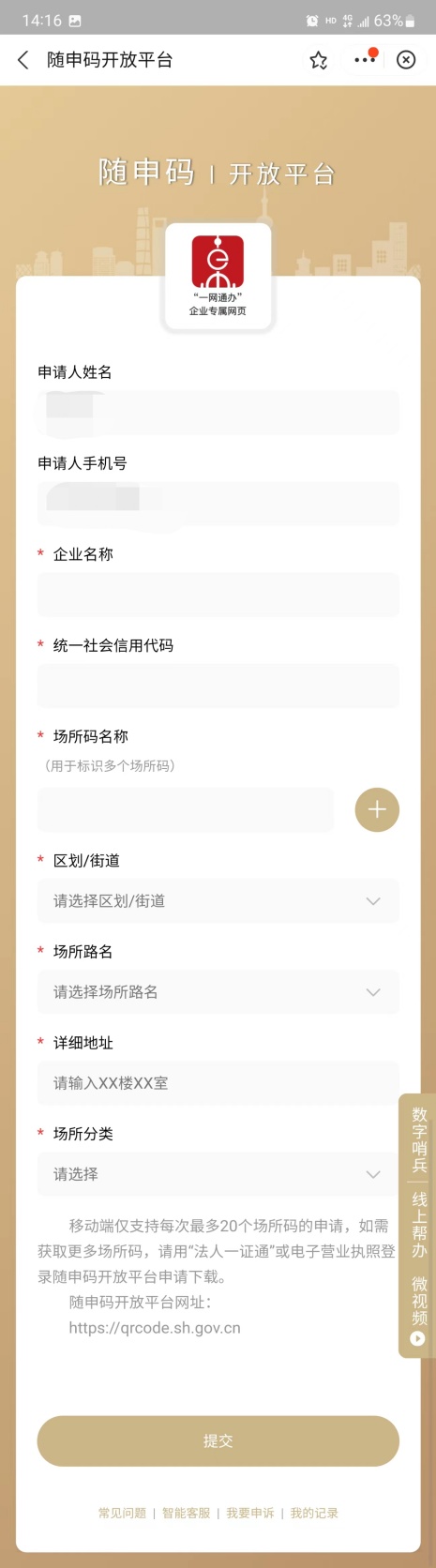 第二步:进入“场所码”申领页面,填写信息确认无误后点击“提交”。系统已对用户输入地址进行标准地址校验,确保申领单位输入的地址数据规范、有效。