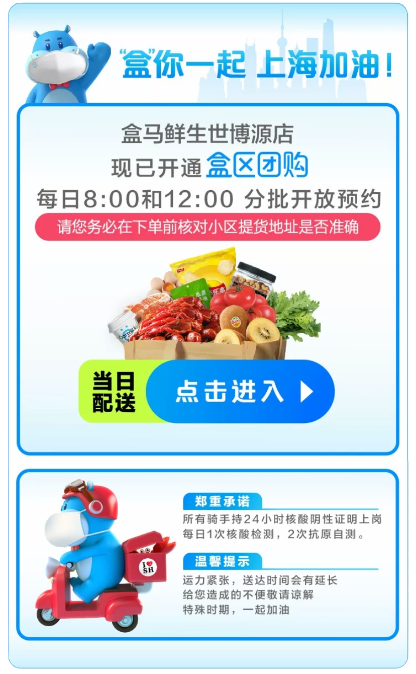 不管对盒马鲜生熟不熟悉,经过这次封控之后我们对于在盒马app上进行“抢菜”这个动作早已炉火纯青。现在,终于迎来了它线下十余家门店恢复营业的消息,这对于小区属于防范区,家附近有盒马生鲜的居民来说就方便了很多。