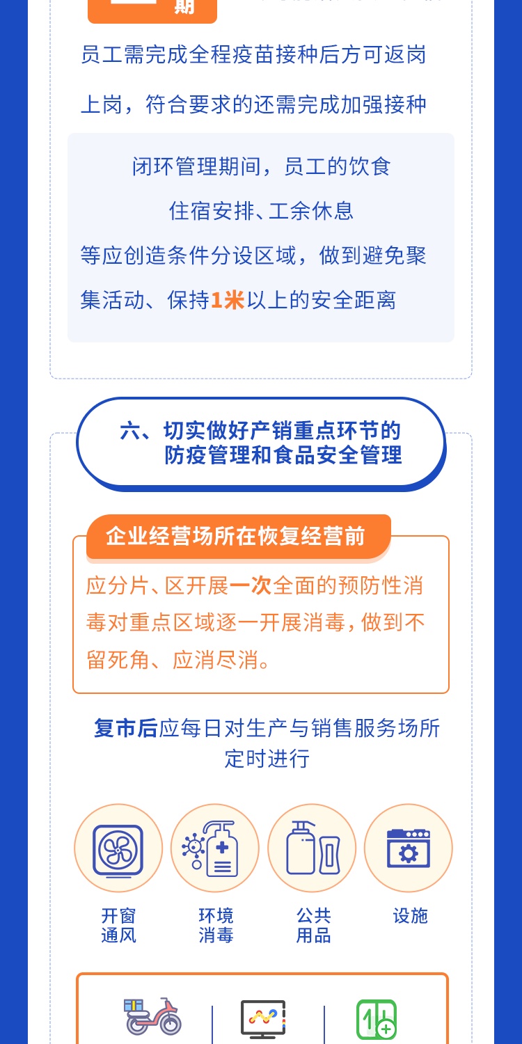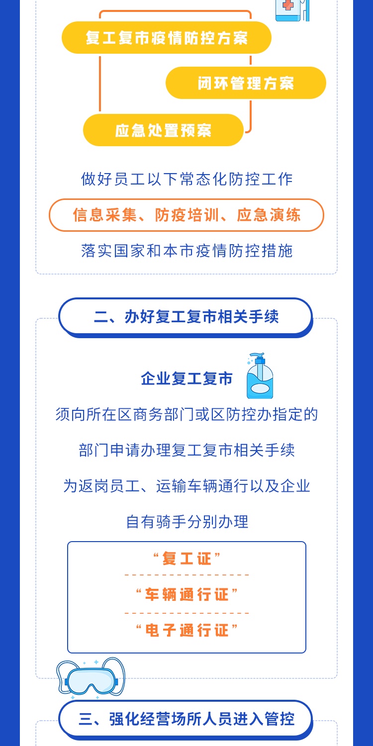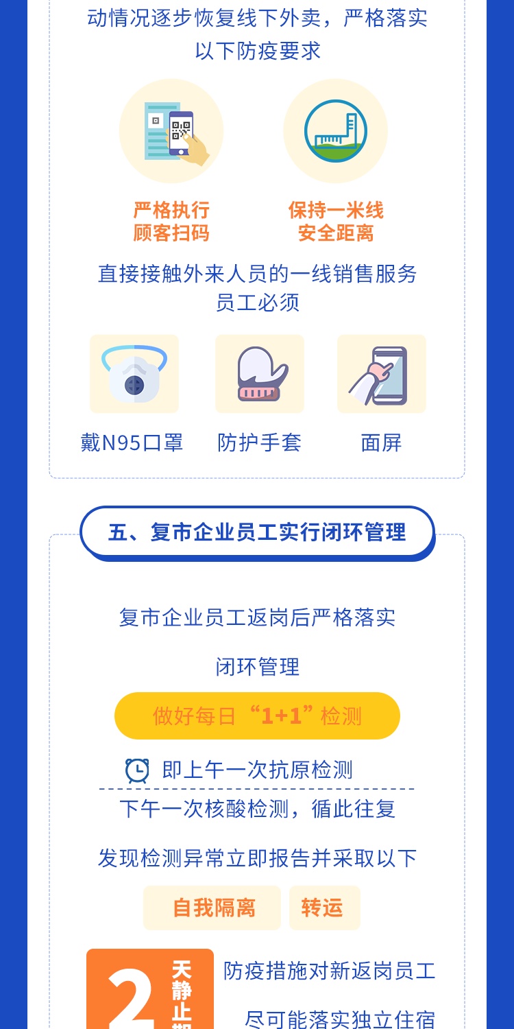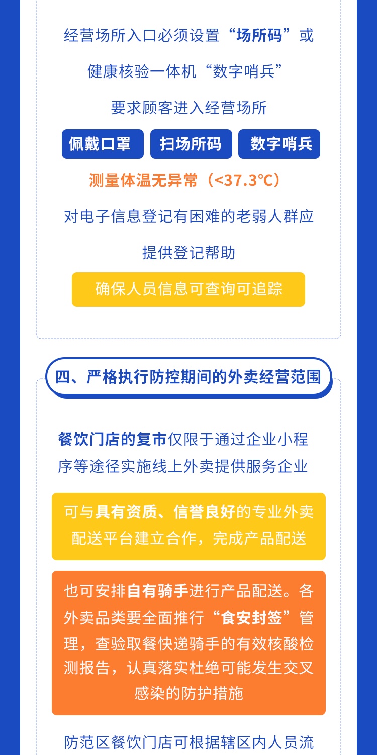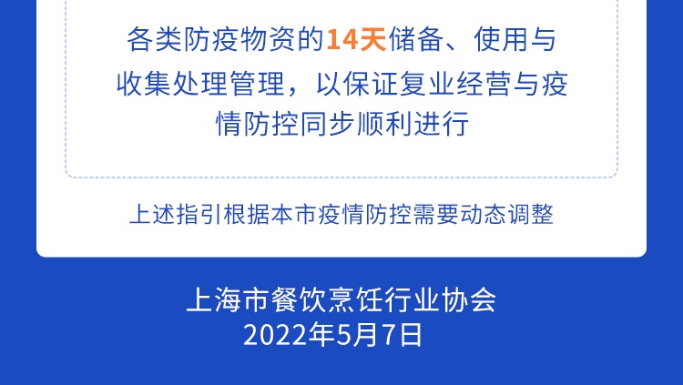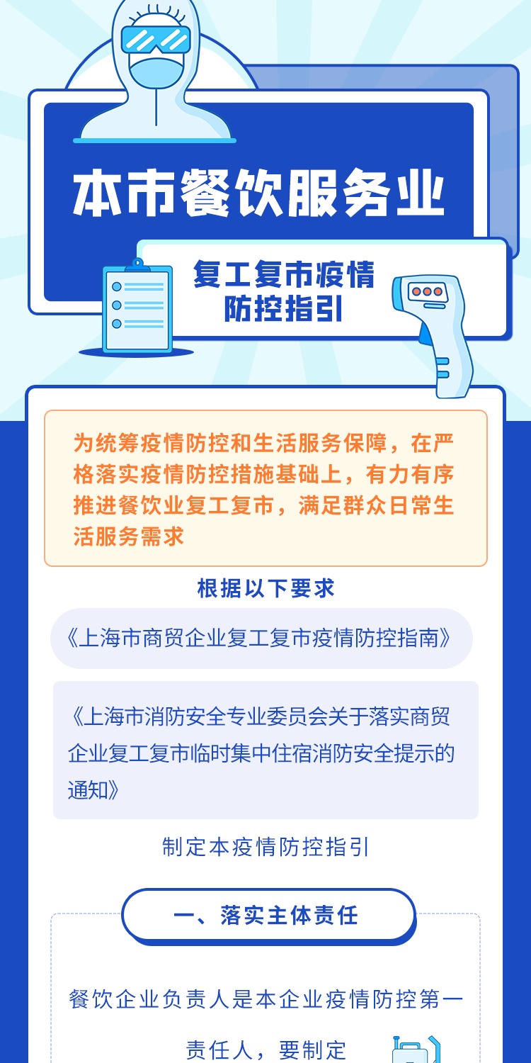 为统筹疫情防控和生活服务保障,在严格落实疫情防控措施基础上,有力有序推进餐饮业复工复市,满足群众日常生活服务需求,市商务委根据《上海市商贸企业复工复市疫情防控指南》、《上海市消防安全专业委员会关于落实商贸企业复工复市临时集中住宿消防安全提示的通知》制定本疫情防控指引。《指引》包括落实主体责任、办好复工复市相关手续、强化经营场所人员进入管控等八个方面。详见↓