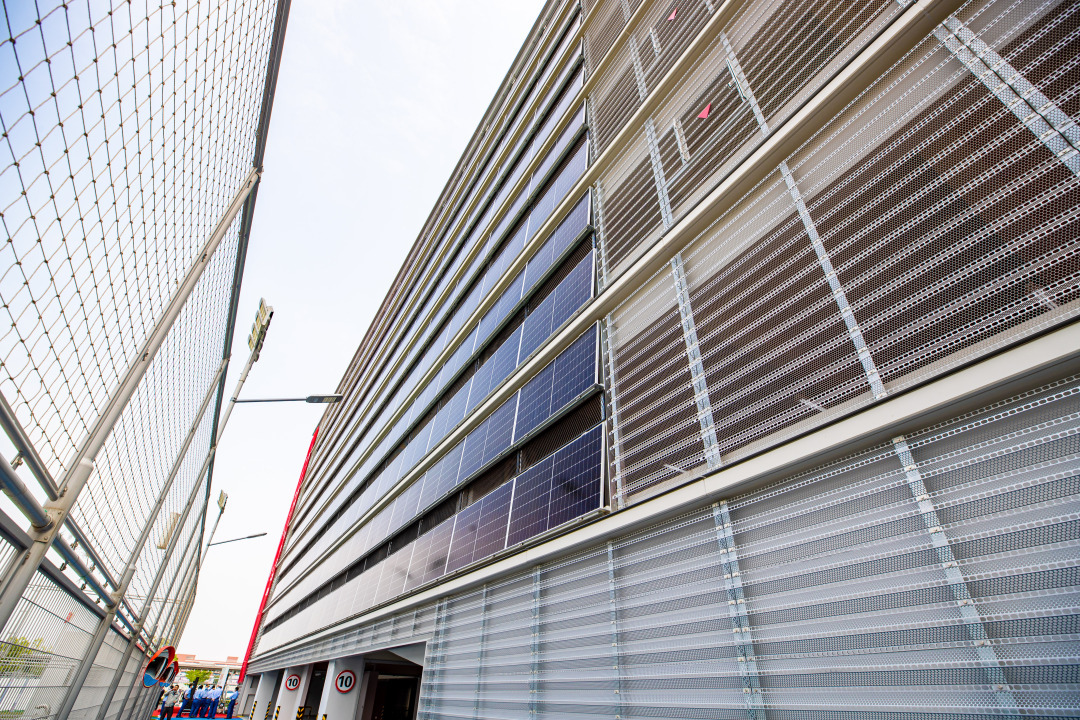 无锡村田电子有限公司环境安全部科长钱飞告诉记者,这座负碳立体停车场共使用了近1500块太阳能发电板。