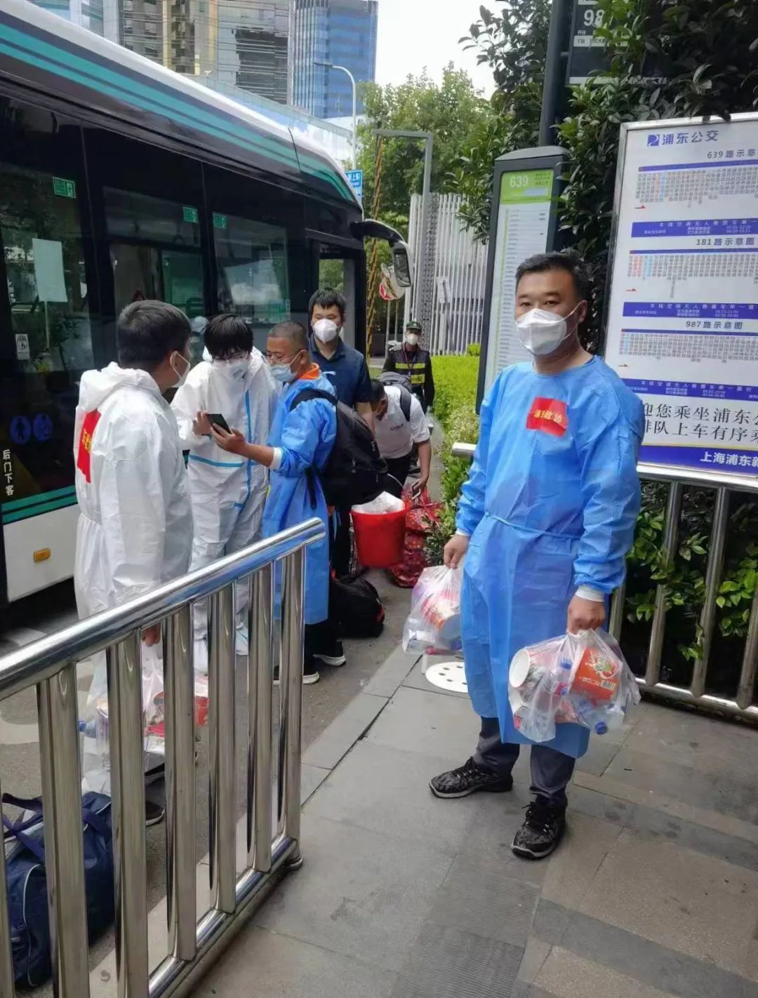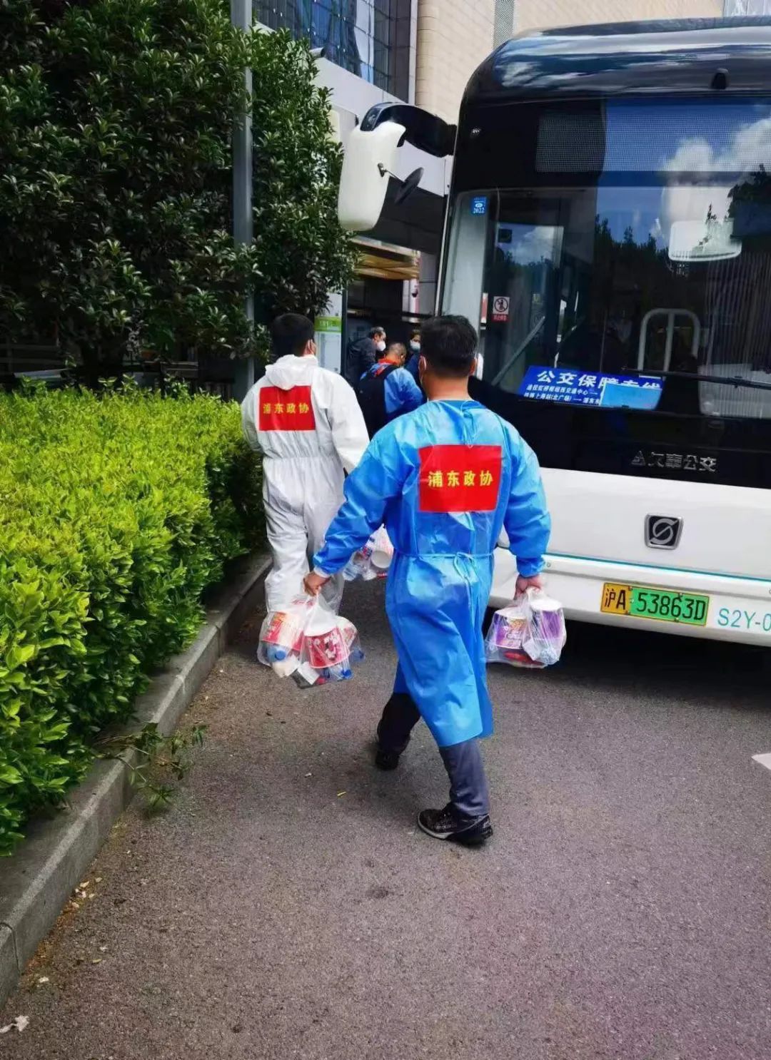 “谢谢你们来过上海!谢谢你们来过浦东!”5月23日下午,浦东新区潍坊路公交枢纽站,防护服上贴有“浦东政协”标签的志愿者,为在此登车前往虹桥站的离沪人员送上包括方便面、熟鸡蛋、牛奶、火腿肠等在内的爱心物资,开展新区政协委员爱心传递活动。