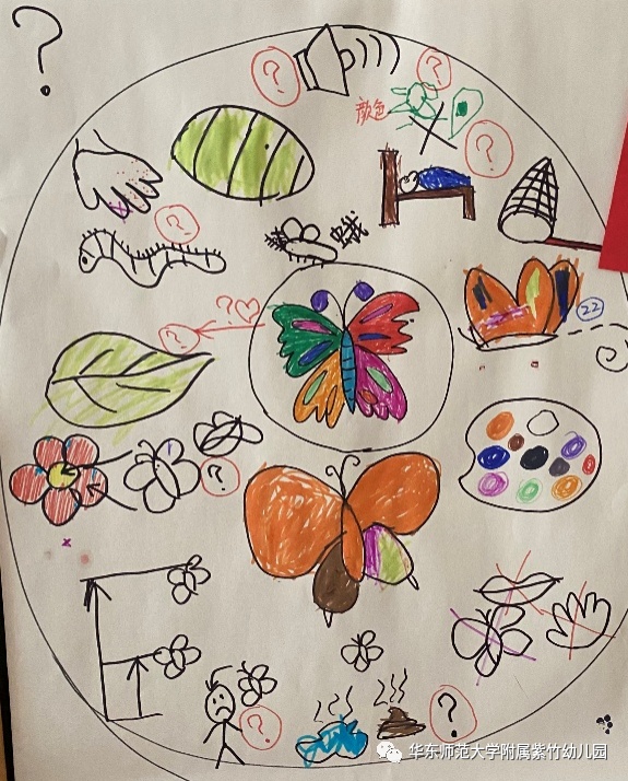 回到幼儿园的博物馆教室后,孩子们在老师的带领下借助思维导图提出与蝴蝶相关的问题、通过观察蝴蝶标本了解它们的外形特征、去户外观察、向专家请教等方式展开了一场探秘之旅。