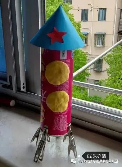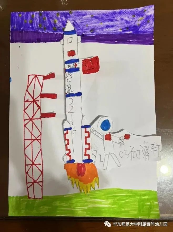有的用画笔画出了自己心中的火箭、太空和空间站;有的用磁力片、乐高和积木搭建出火箭的造型;还有的孩子利用家中现有的材料,制作了火箭的模型。