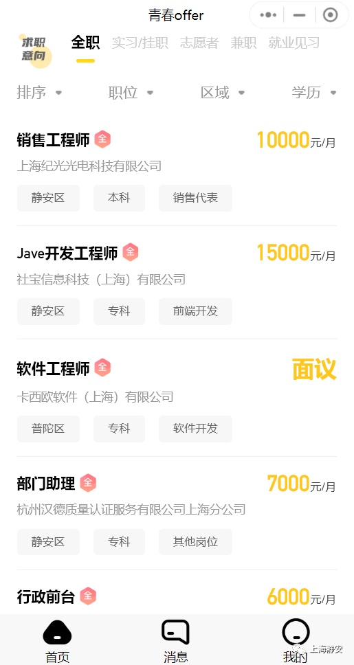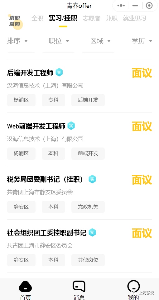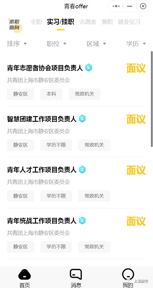 在静安“青春offer”小程序上