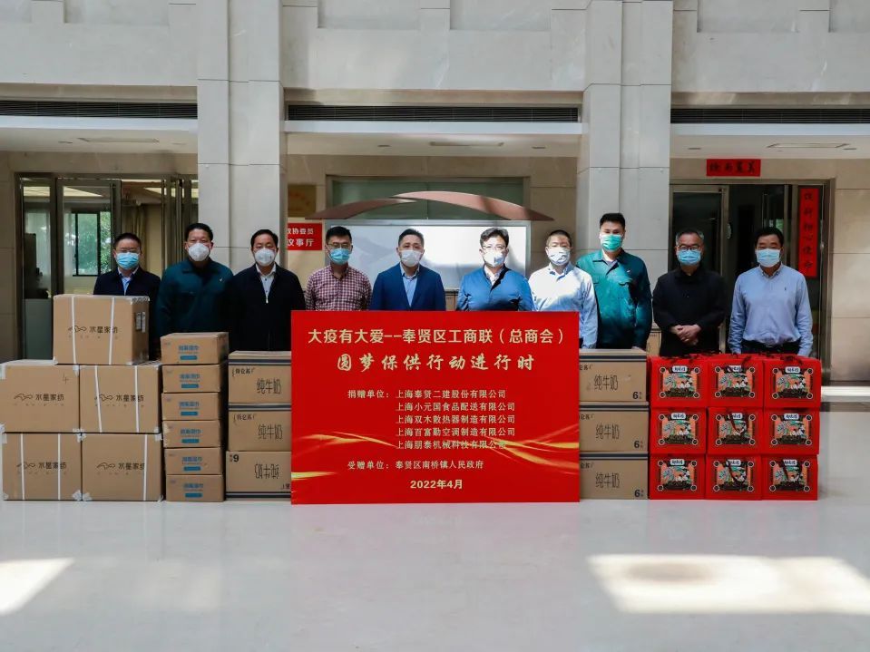 公司董事长朱林群、总经理张杰分别为奉贤区民营经济协会送上价值1万元的食用油和捐款,助力奉贤区民营协会更好的为困难企业、福利院提供帮助。为南桥镇的居民送去圆梦保供物资——价值12万的牛奶,以此表达南桥企业的爱心与力量,上下联动,合力抗疫,全力保障百姓生活必需品。