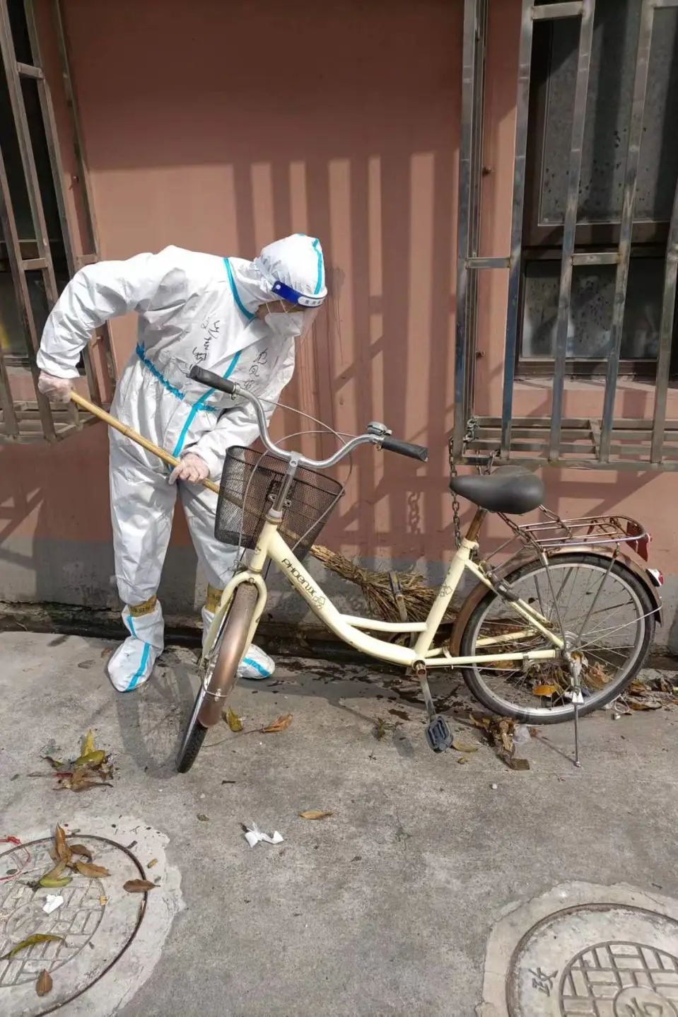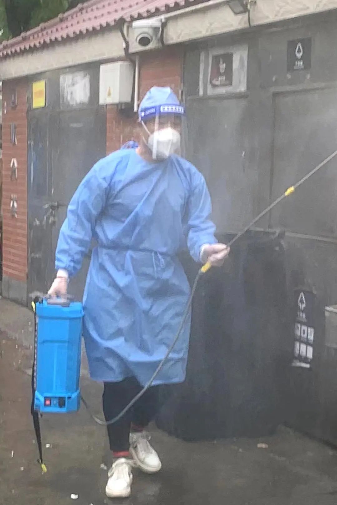 单一个装满垃圾的桶就重达200-300斤,小区里127个门洞,就有127只垃圾桶,而我们总共就只有6名保洁员,每个人要负责21只垃圾桶,他们一路拖拽,要往返几十次,才能将其全部垃圾拖到固定点位。消杀、打包、整齐堆放后等待环卫清运。身穿不透气的防护服,加上高强度的工作令他们汗流浃背,贴身的衣服早已全部湿透,但是咬紧牙关,没有一个人叫苦叫累。