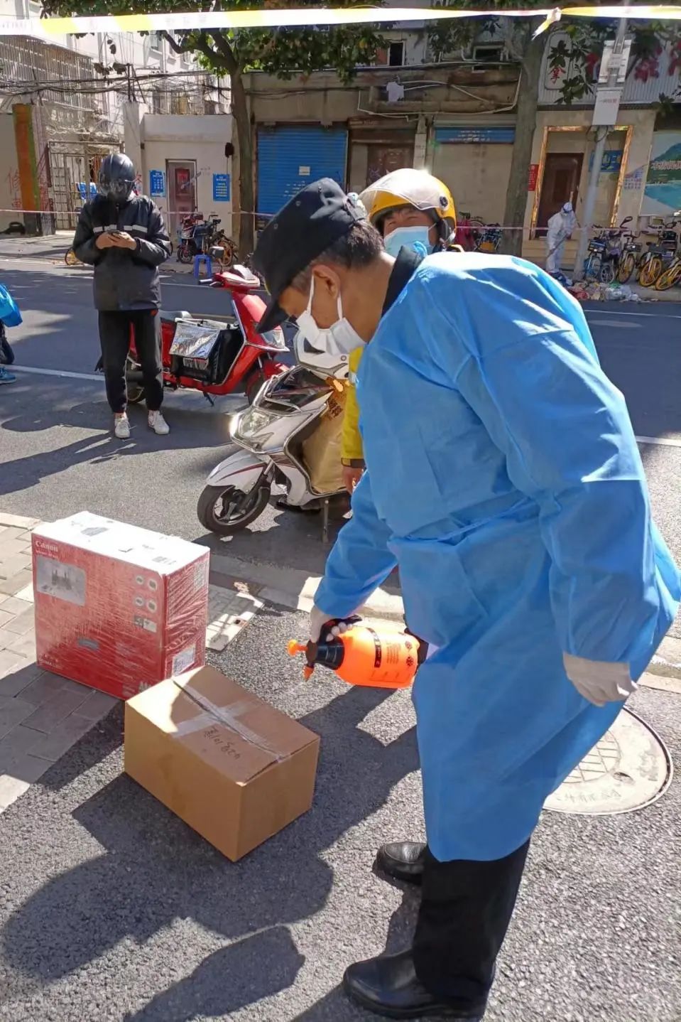 控江五村是个老年社区,居民以老年人居多,缺乏身强力壮的年轻志愿者,加之近期物资发放量激增,保洁员除了本职工作以外,还肩负起了协助居委会帮助居民搬运并且配送生活物资和抗疫物资的工作。他们将平日里自己用来搬运杂物的几辆黄鱼车、三轮车全部调配出来,充足电、打足气,充当起“骑手”的角色。