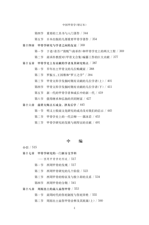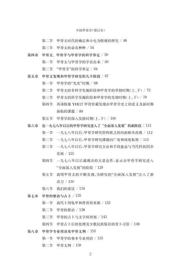 《中国甲骨学(增订本)》共两册,分上、中、下三编,33章,约85万字。作者从甲骨文的发现和命名出发,阐述了百年来甲骨学的发展历程,尤以对1978年以后甲骨学研究进入“全面深入发展”的新阶段进行了深度剖析;对甲骨文和甲骨学进行了科学界定,同时对甲骨学的基础知识作了充分详细的讲解,更有作者在甲骨文殷商史研究领域的成果展示,是对一百二十年来甲骨学史的全面回顾。该书亮点纷呈,以下择其要者略作阐述。