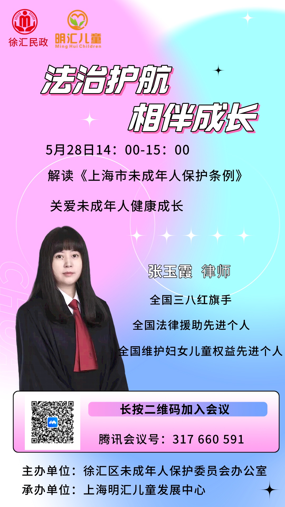 徐汇区未保办特邀张玉霞律师,为家长和小朋友解读《上海市未成年人保护条例》。张律师将从家庭监护职责、学校保护制度、社会保护等方面,为家长和小朋友普及未保条例内容,强化未成年人是被保护的主体,进一步提升未成年人学法懂法用法的意识水平。
