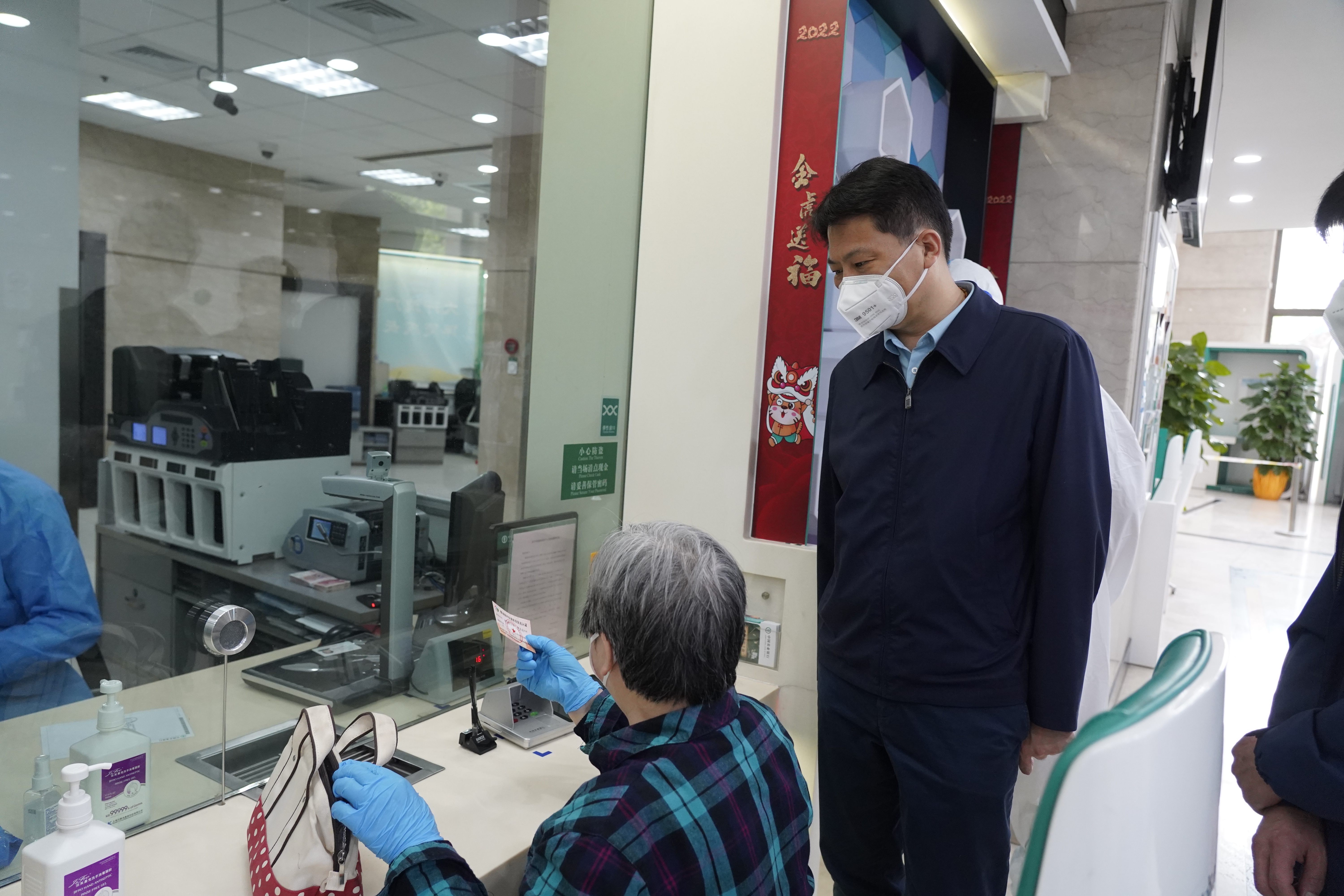 姜冬冬一行在中国农业银行普陀支行察看防疫工作落实情况