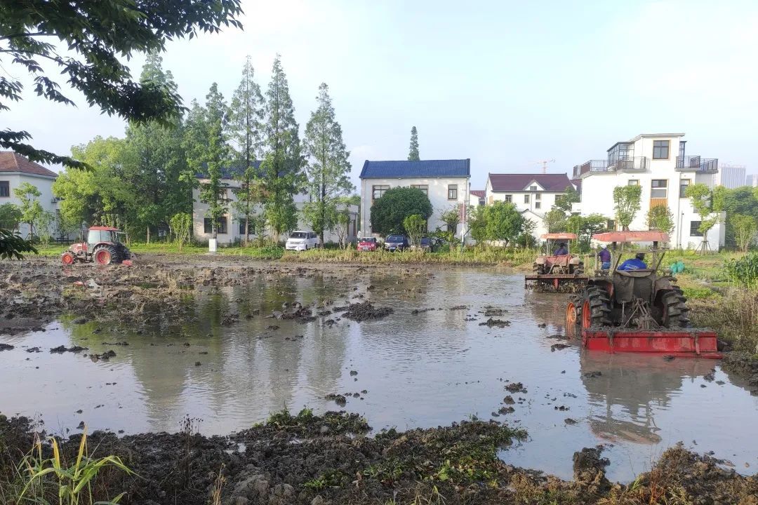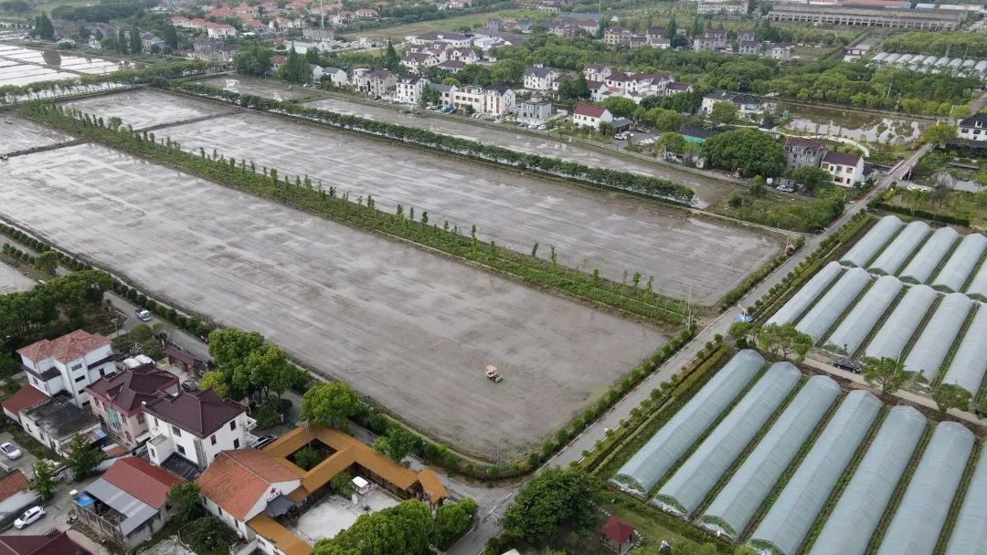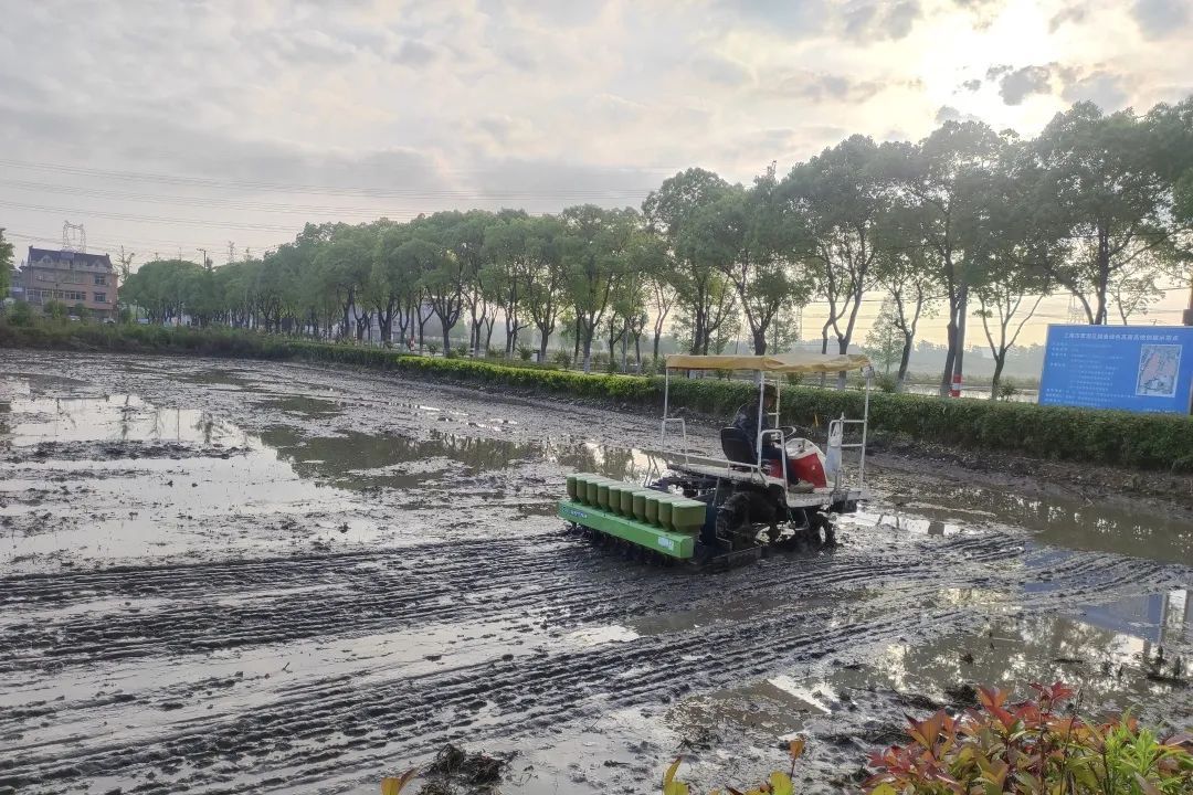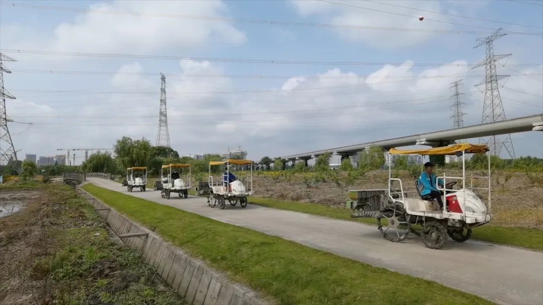 在位于盈港东路与佳悦路附近的赵巷镇和睦村“乐道乐稻”水稻田内,本应是一派农忙插秧的火热场景被一台台水稻机穴直播播种机的轰鸣声所取代。来自上海友睦专业农业合作社的“职业农民”黄能正和他的11位伙伴驾驶着农机在田地里来回穿梭。