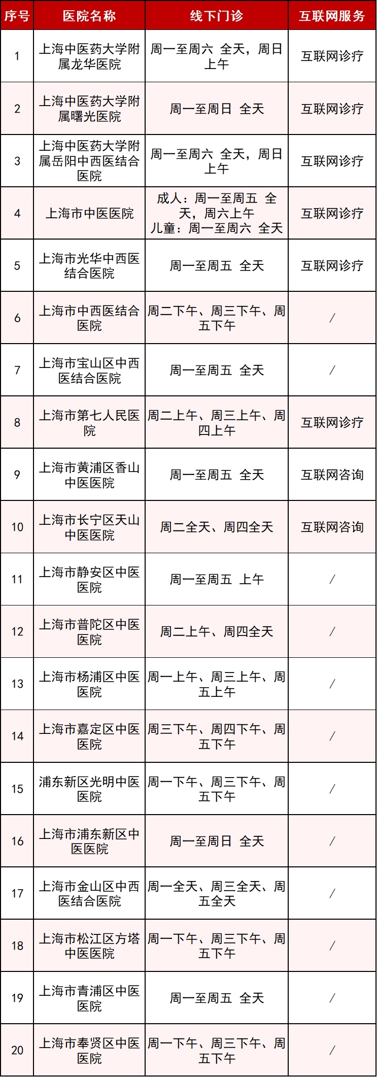 本市中医医院新冠康复门诊一览表