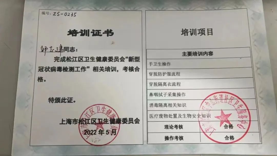 眼下,核酸检测成为企业复工复产的一门“必修课”。为了减轻医务人员负担,中联重科基础施工机械公司选派邹志建和刘校喜两人,前往中山街道党群服务中心参加松江区卫健委组织的相关培训,两人均顺利通过了理论和操作考核,于5月9日取得培训合格证书。