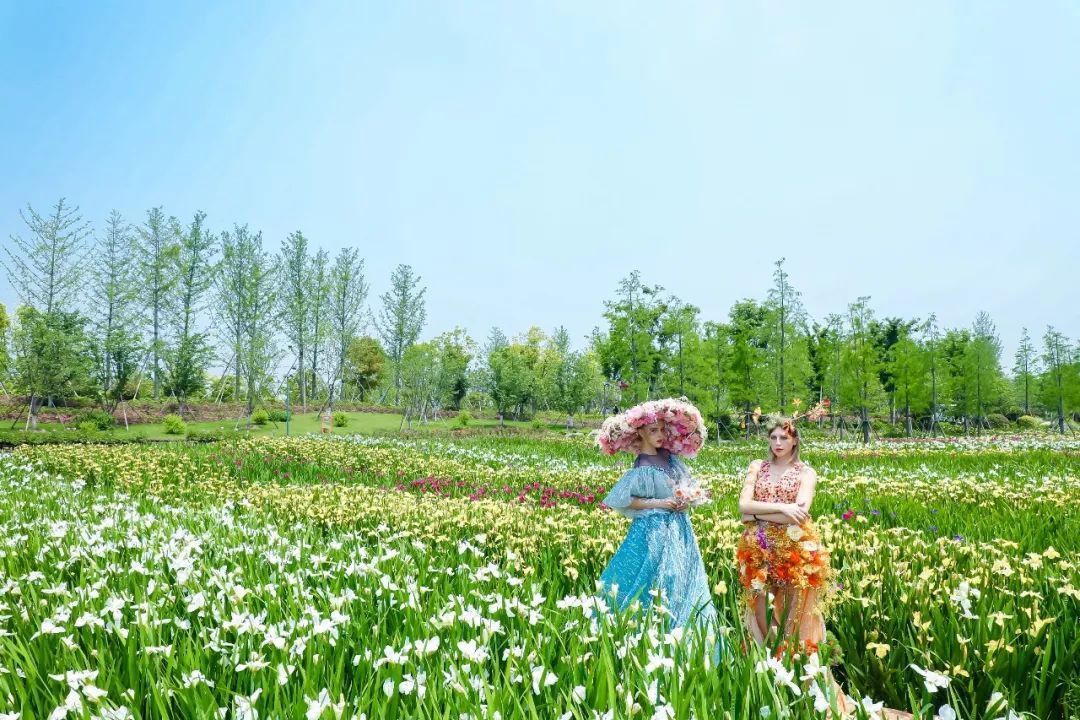 在奉贤上海之鱼泡泡公园内,沿着十字水街浦南运河边,五彩鸢尾临水而放。鸢尾花田占地1万平方米,共计56000株,品种以路易斯安娜与混色花菖蒲为主,共选用了劳拉(黄色)、红瑞特(红色)、现在与永远(蓝色)、白色恋人(白色)、黑色斗鸡(紫黑色)等5个品种。不同品种花期略有早晚,整片花田花期为5月上旬-6月上旬。