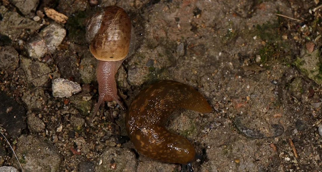 灰巴蜗牛(左)和黄蛞蝓(右)