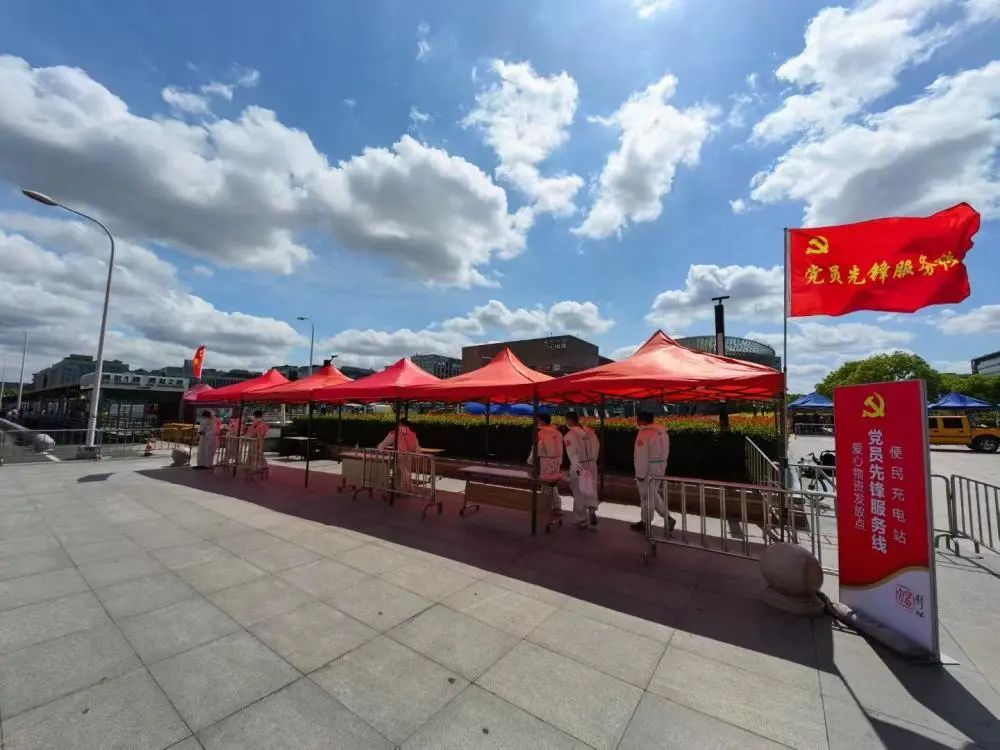 “5月19日,我们到达虹桥火车站后发现,不少旅客因为核酸过期或没买到车票等原因无法立刻进站,滞留在火车站。有的旅客蜷缩在屋檐下面,真的很让人心疼”。次日,在虹桥火车站西广场,新虹街道设立了党员先锋服务线,新虹城建中心党支部周玮带领党员突击队,在这里为旅客发放爱心物资,搭建了遮阳伞和雨棚,让滞留的旅客有一个可以遮风挡雨的休憩处。