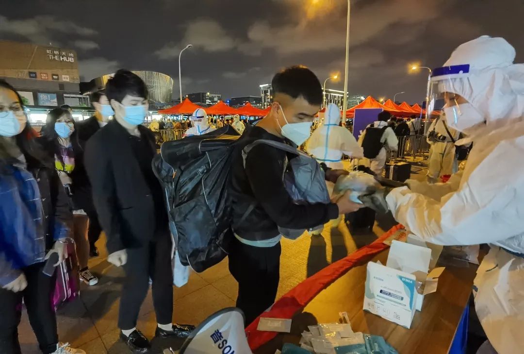 虹桥火车站,红蓝色的遮阳棚连成一片,延续至目光所及之处。棚下的是风尘仆仆赶来车站,等待买票或检票的旅客。或骑车、或步行,到达火车站的他们已经精疲力竭,一旁身穿大白的工作人员递上了物资包。“袋子里是矿泉水和一些食物,谢谢你们来过上海”。