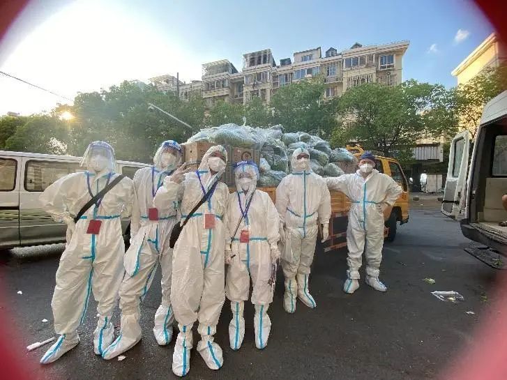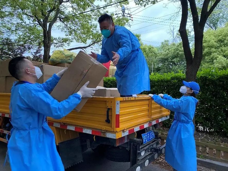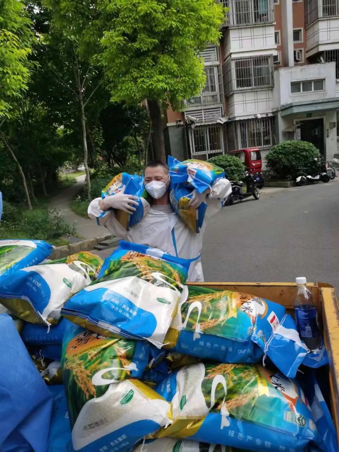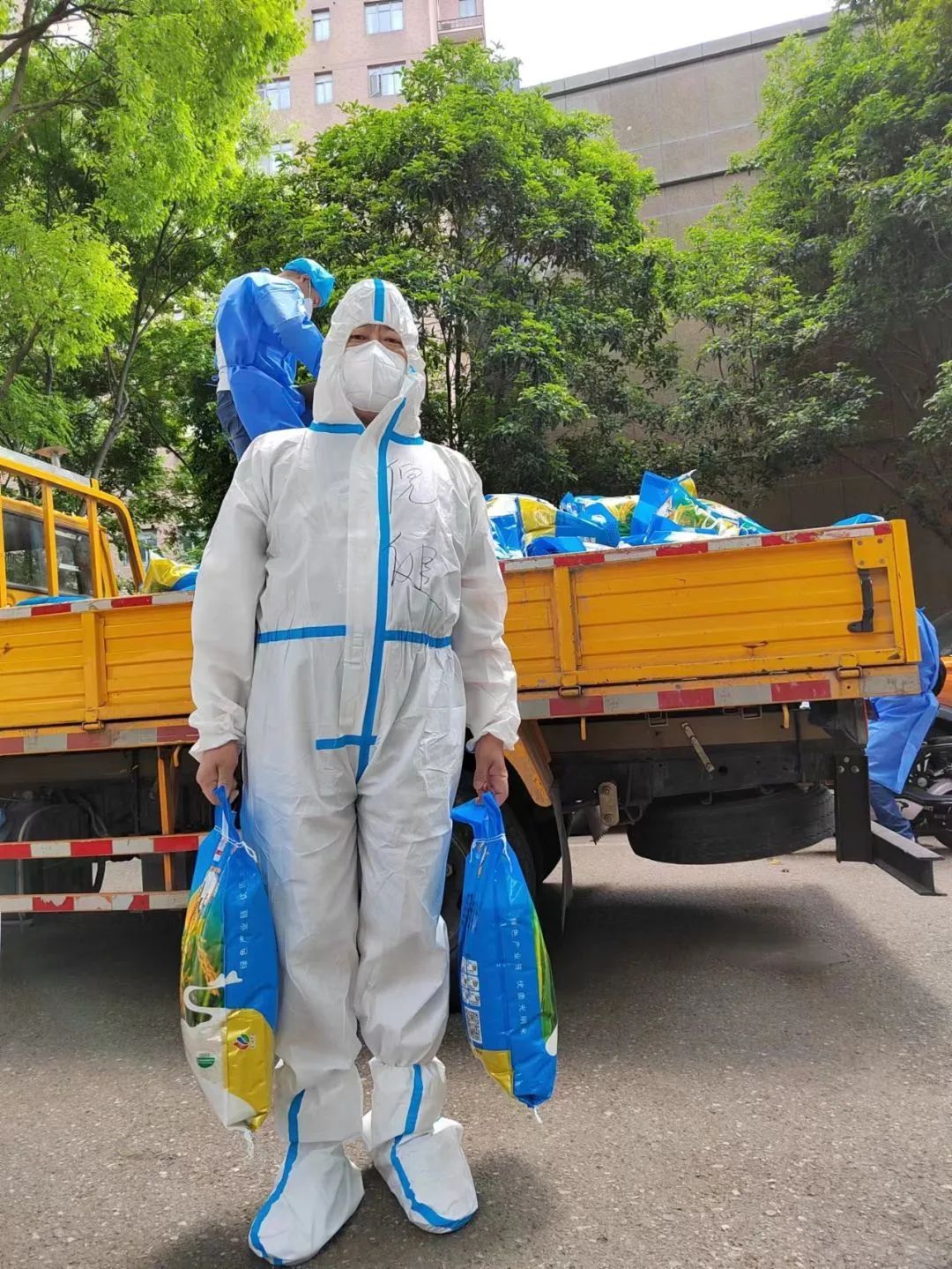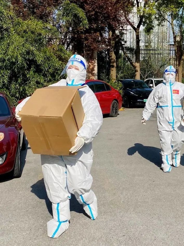 志愿者们在统一安排下,穿好防护服,把一箱箱物资运送到居民楼,每天几乎要配送上万件物资,从清晨忙到深夜才休息。