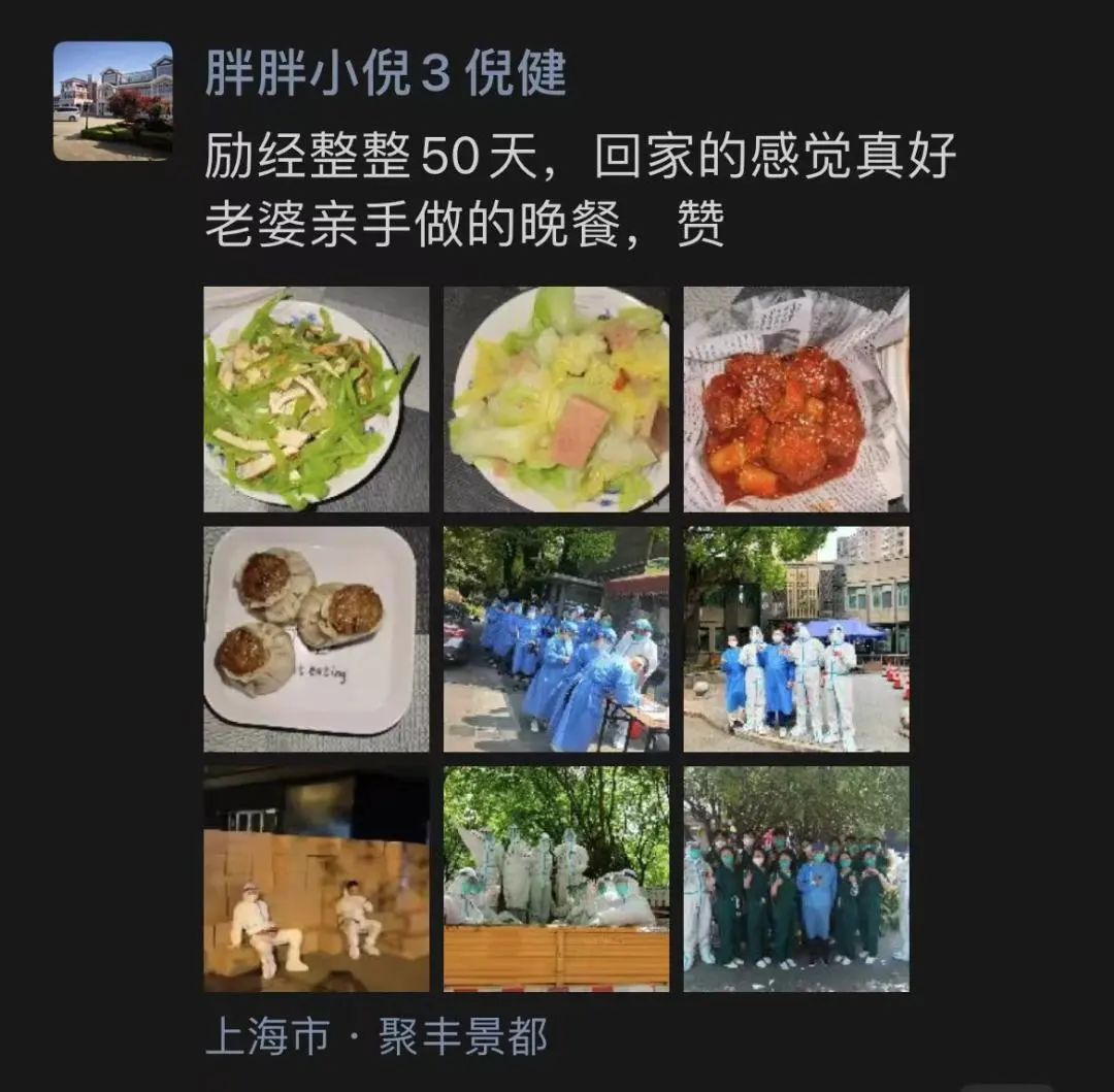 5月19日,党员志愿者倪健回家吃晚饭,在朋友圈感慨地写到:“历经整整50天,回家的感觉真好!老婆亲手做的晚餐,赞!”