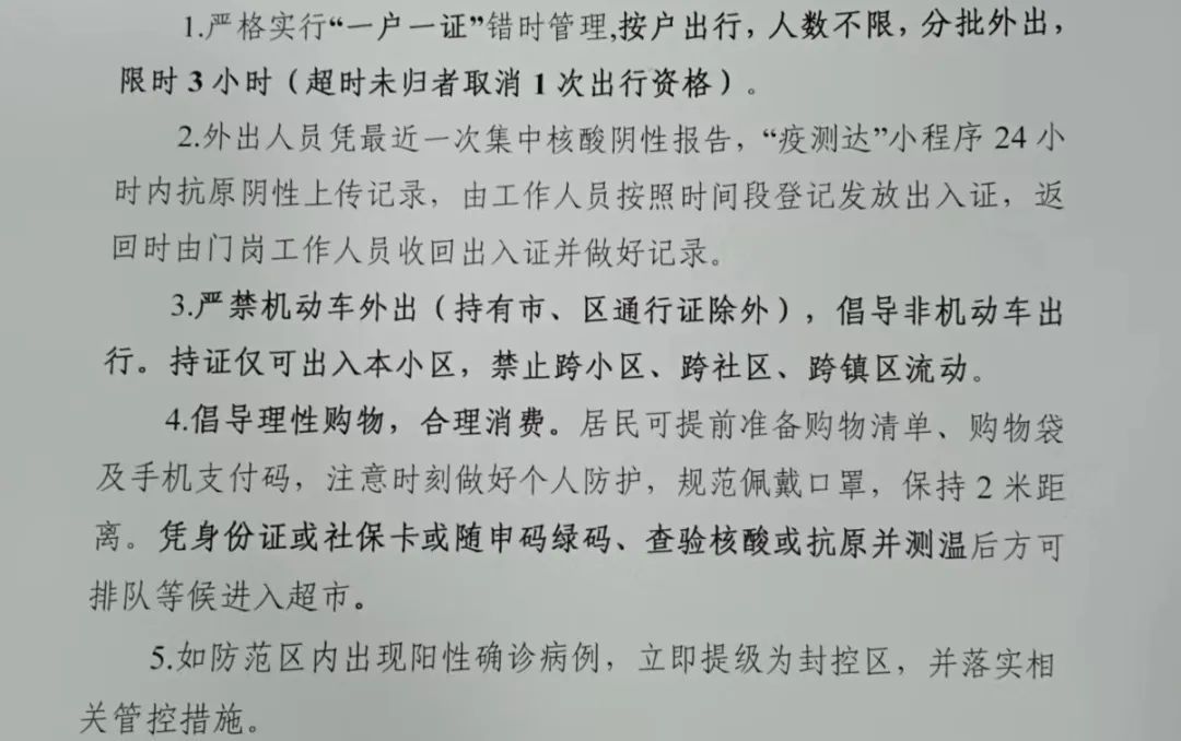 无论离开还是返回小区均需持相应证件。离开小区时,居民需持单位证明、48小时核酸证明离开小区。在馨悦名邸,居民返回小区时,需提供单位证明,写明闭环管理的时间地点、核酸抗原等情况,同时持48小时核酸证明,并在小区门口进行抗原自测,结果为阴性后,方可返回小区,一旦返回则短期内不能再离开小区。馨悦名邸暂不接受从其他小区返回该小区的居民。金色雅筑可接受小区、企业等地返回的居民。同样一旦返回则不能在短时间内离开小区。