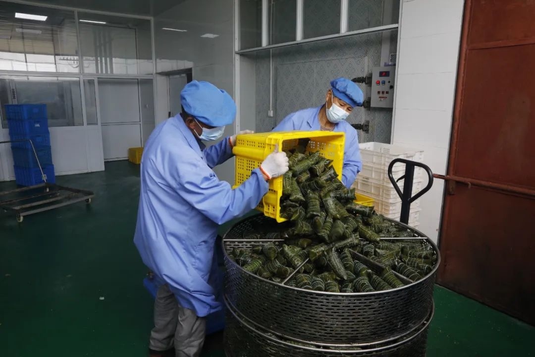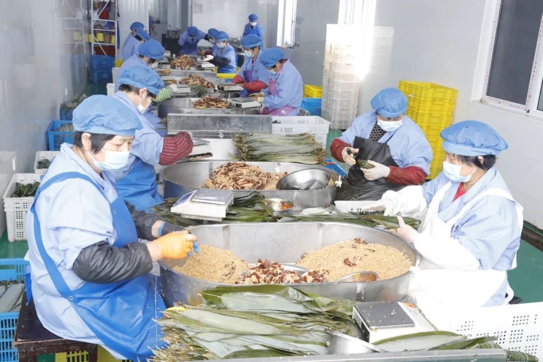 记者在枫泾叶聚兴粽子厂看到,生产车间内工人们各司其职,10多名工人正在娴熟地包着粽子,只见他们在粽叶上放入糯米和配料,随着手指的翻动,一绕、一捆,不出15秒一个粽子就包好了。