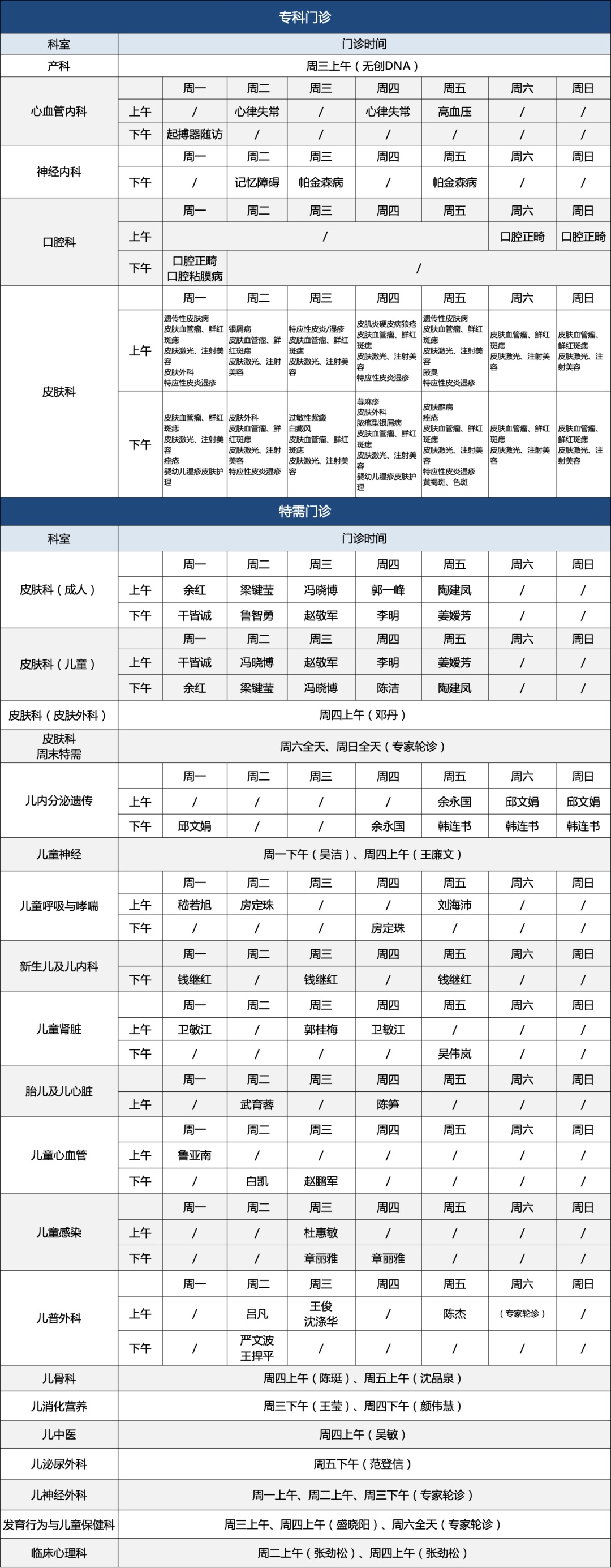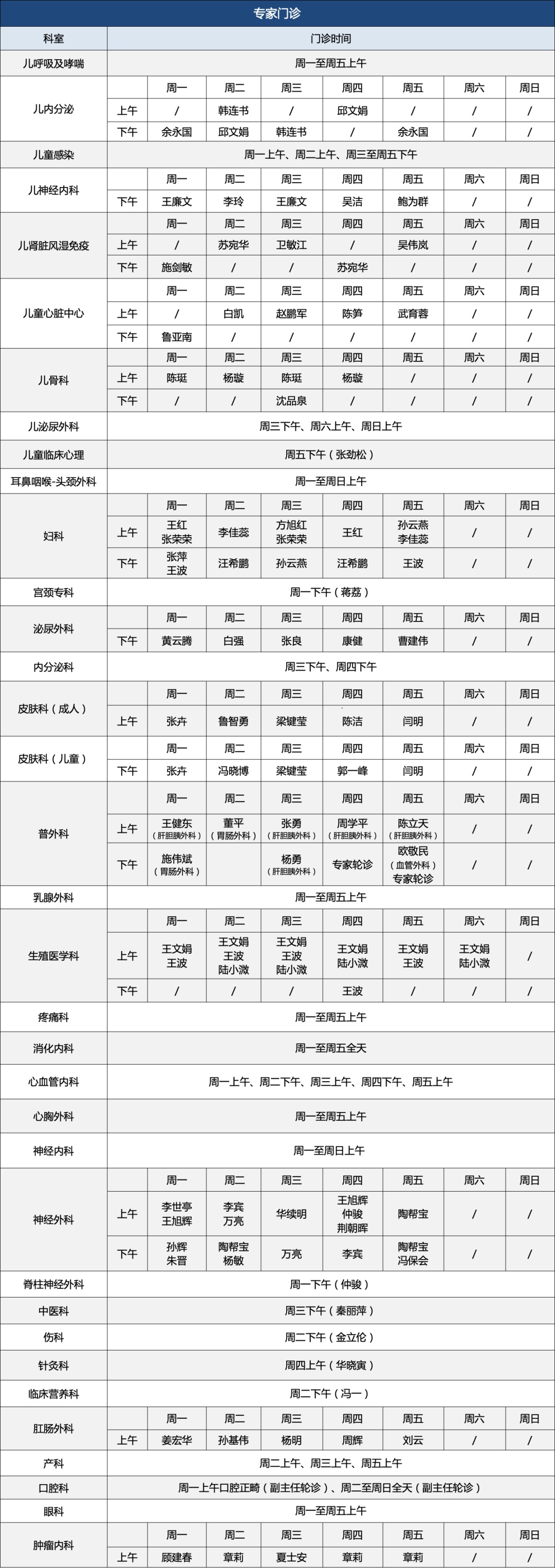注意事项:1、除部分实名专家外,其余专家门诊均为专家轮诊制;2、此表谨作参考,以当日医院安排为准。