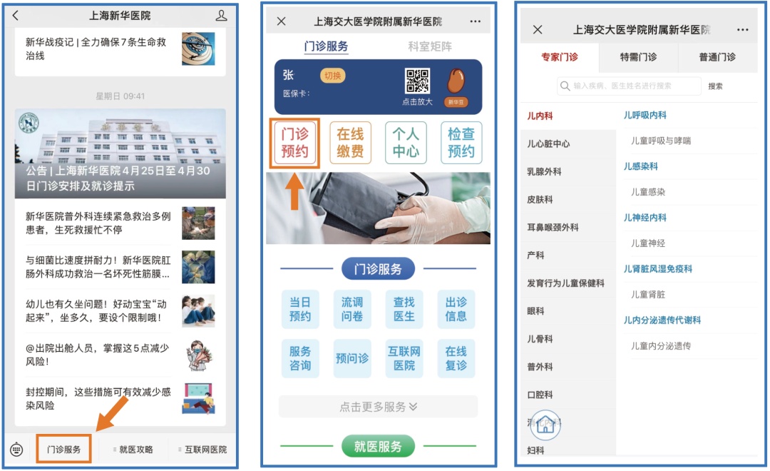 门诊预约请从“上海新华医院”微信服务号进入,点击“门诊服务”—“门诊预约”。