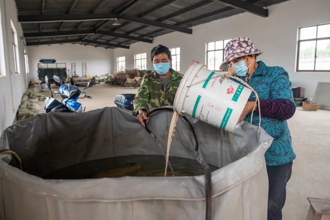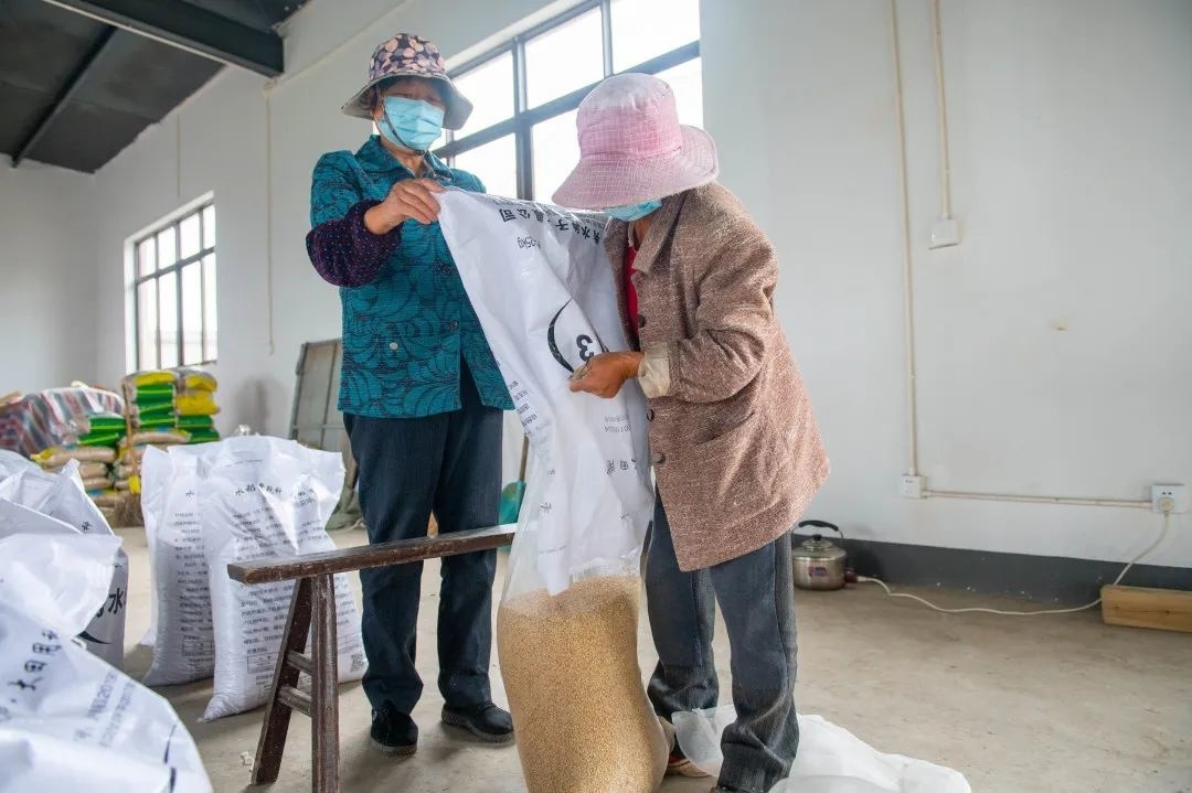 日前,在金光村经济合作社仓库里,负责人黄五弟正在为农户浸种。工作人员两两一组,将种子倒入浸种袋中,每袋装25斤放入浸种箱内,注水加药、恒温消毒。黄五弟表示,种子在浸种箱浸泡48小时后进行催芽,一般需要2至3天,稻种破口就可以播种了。每个浸种箱可浸种500-800斤种子,有效减轻了种植户分散浸种催芽的劳动强度。合作社每天根据耕地和播种的需求进行浸种,一般到6月中旬结束。