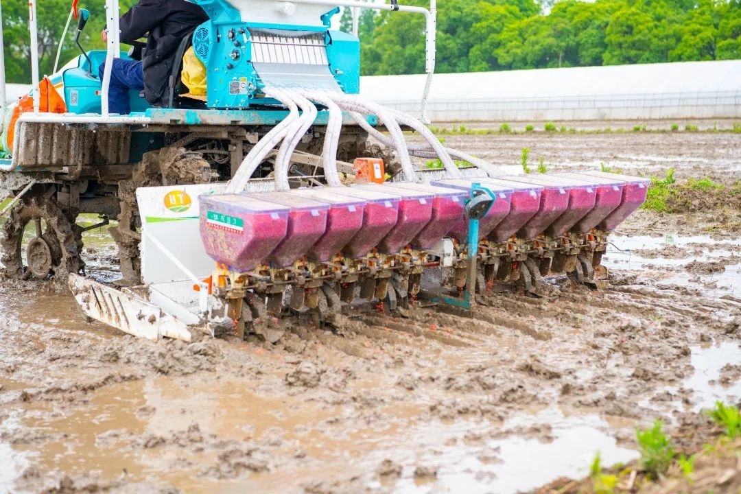 在漕泾镇金光村1组,水稻穴播机在农机手的操作下,将已培育好的稻种,按照设定距离,均匀地播撒在农田里。