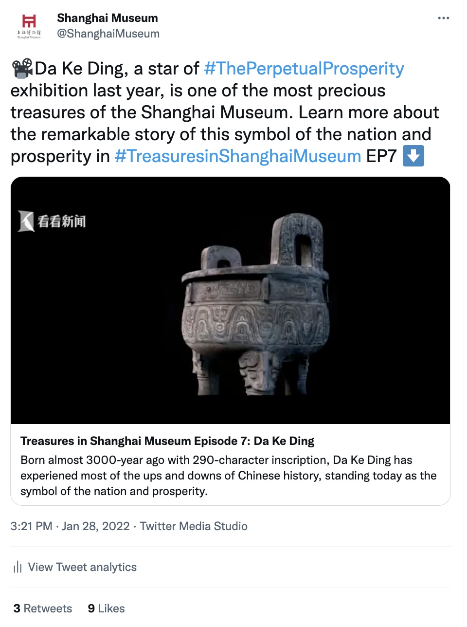 多渠道营造海外传播势能,上海博物馆将不断进行尝试与突破,持续拓展博物馆文化影响力。不久前,在中国文物交流中心、瞭望东方周刊、文物交流智库和中科智库研究院发布的《2021年度全国博物馆(展览)海外影响力评估报告》中,上海博物馆在“海外综合影响力”榜单中名列全国第二。
