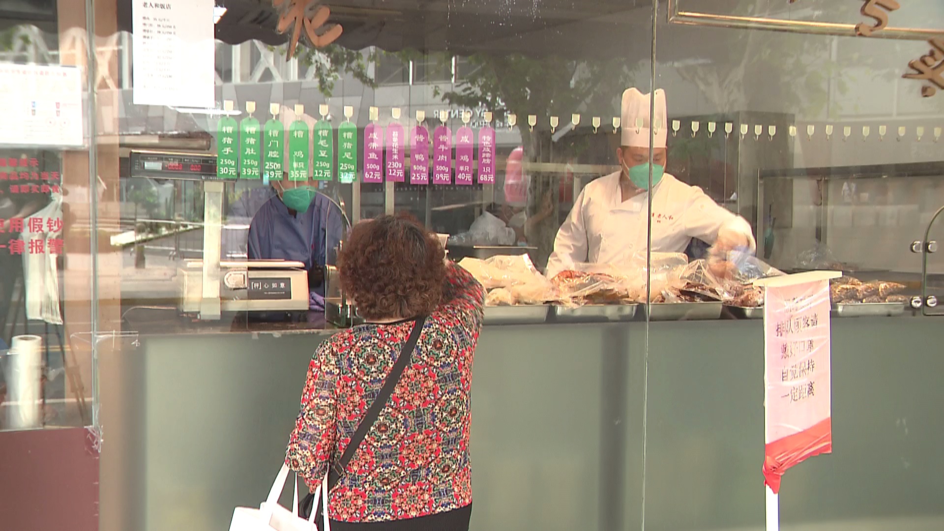 今天中午,记者在淮海路上的老人和饭店门口看到,不少市民都在等候购买熟食,特别是老人和的糟醉食品。一位市民告诉记者:“今天看到这些老字号都开了十分开心的。 这么多日子,吃来吃去就是保供菜。今天来买点荤菜,看到价格没有变化,很开心!”