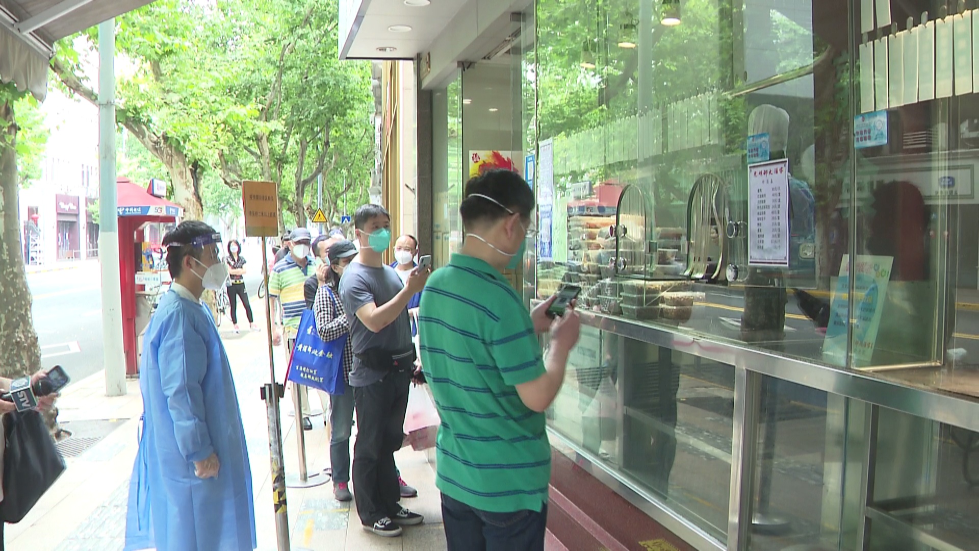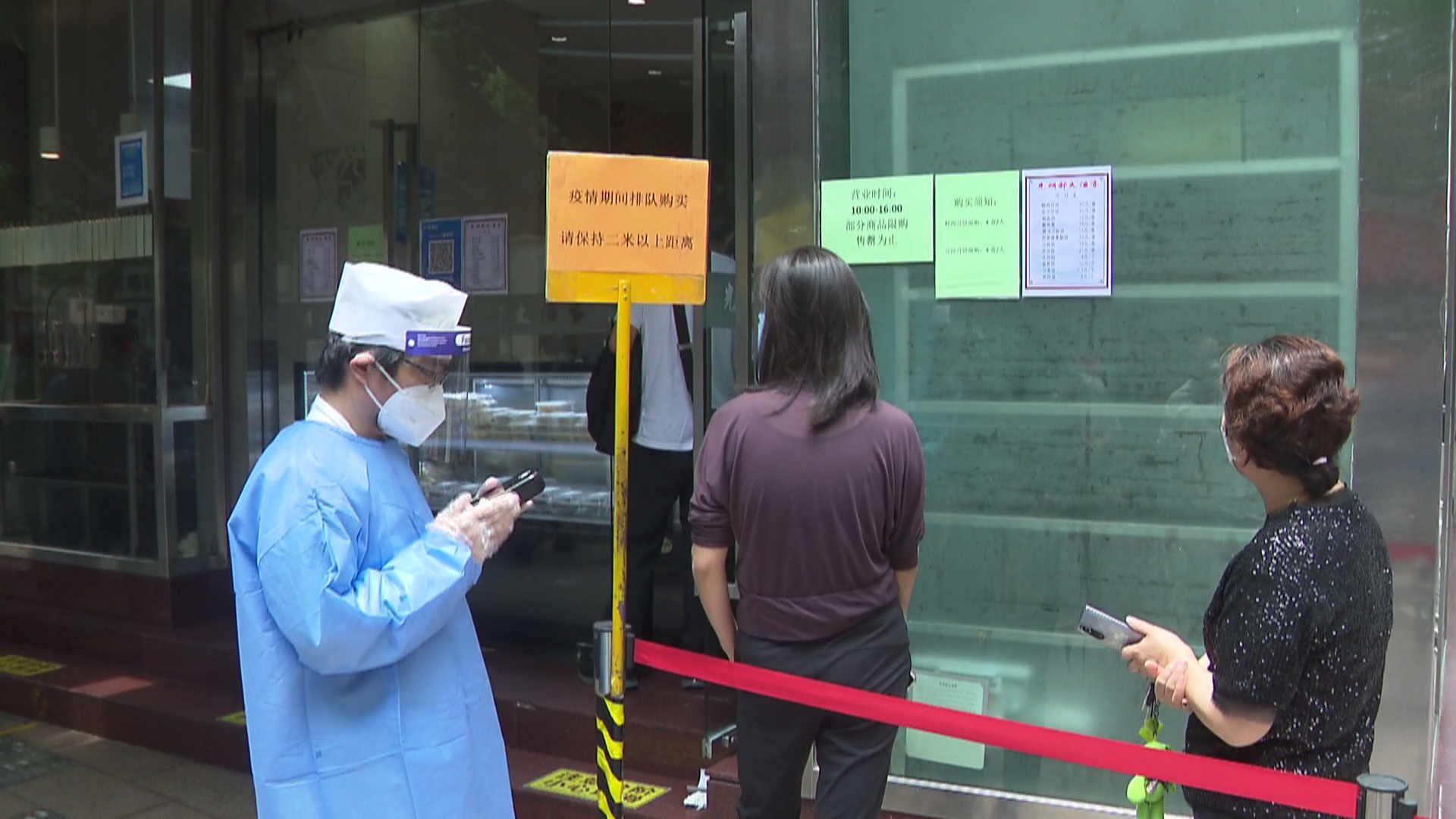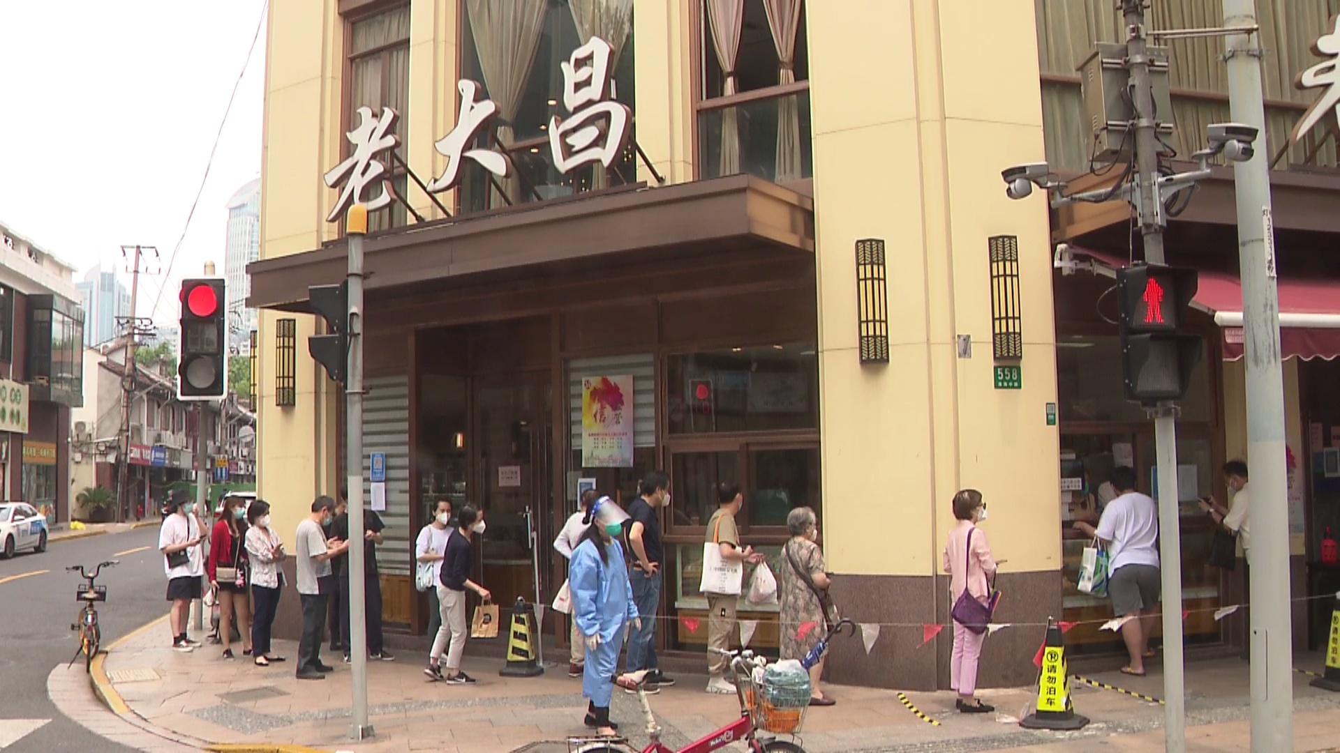 而一旁的老大昌今天也恢复了线下营业,供应的品种有糕点和面包 。与往日不同的是,市民只能在店外通过外卖窗口购买。一位八旬老人告诉记者,心里蛮开心的。今天趁着出来,也给邻居带一点。自己年级大了,疫情期间,都靠一些邻居照顾着,现在自己想回馈,表达下心意。