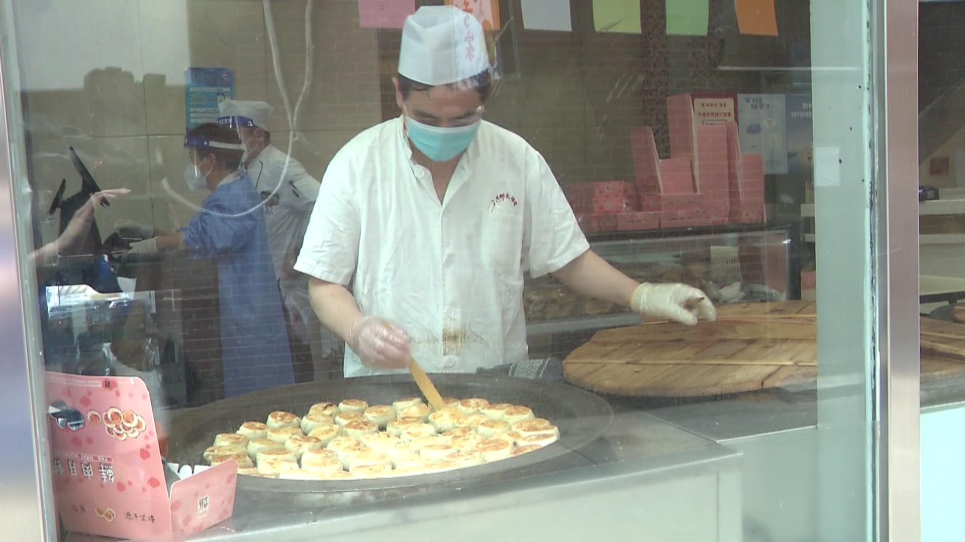 记者看到,透过操作间的大玻璃窗,点心师傅正忙碌着在平底锅烘煎鲜肉月饼,饼皮已经透露出微微的焦黄,阵阵鲜香从外卖窗口中飘出。光明邨大酒家服务主管金鼎文告诉记者:“今天供应的点心就是鲜肉月饼、豆沙月饼、椒盐月饼等。熟食主要是鸭膀、酱鸭、烤麸和椒盐排条等这类东西。”他还表示,店家设置了两米线,让顾客有序地排队。