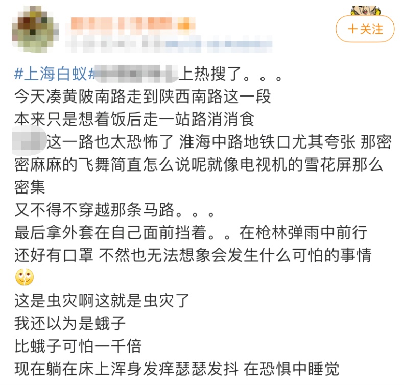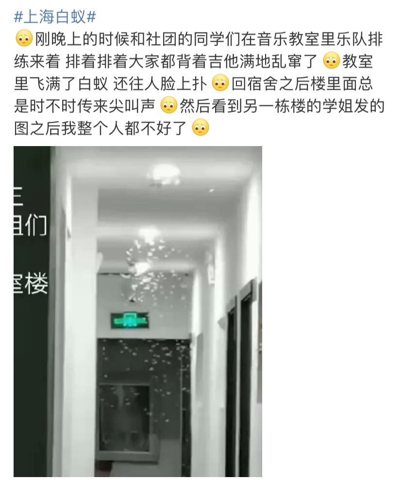 近日,上海天气潮湿闷热,白蚁集中出飞。5月29日晚,#上海白蚁#话题冲上微博热搜,不少网友表示,家里、办公室都已被白蚁攻占,大街上也是密密麻麻的……