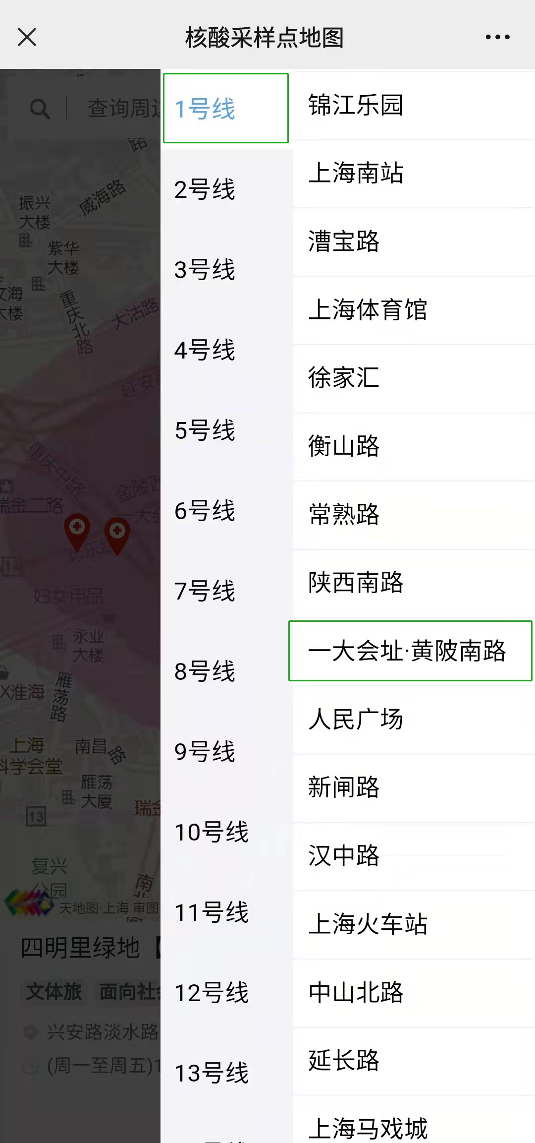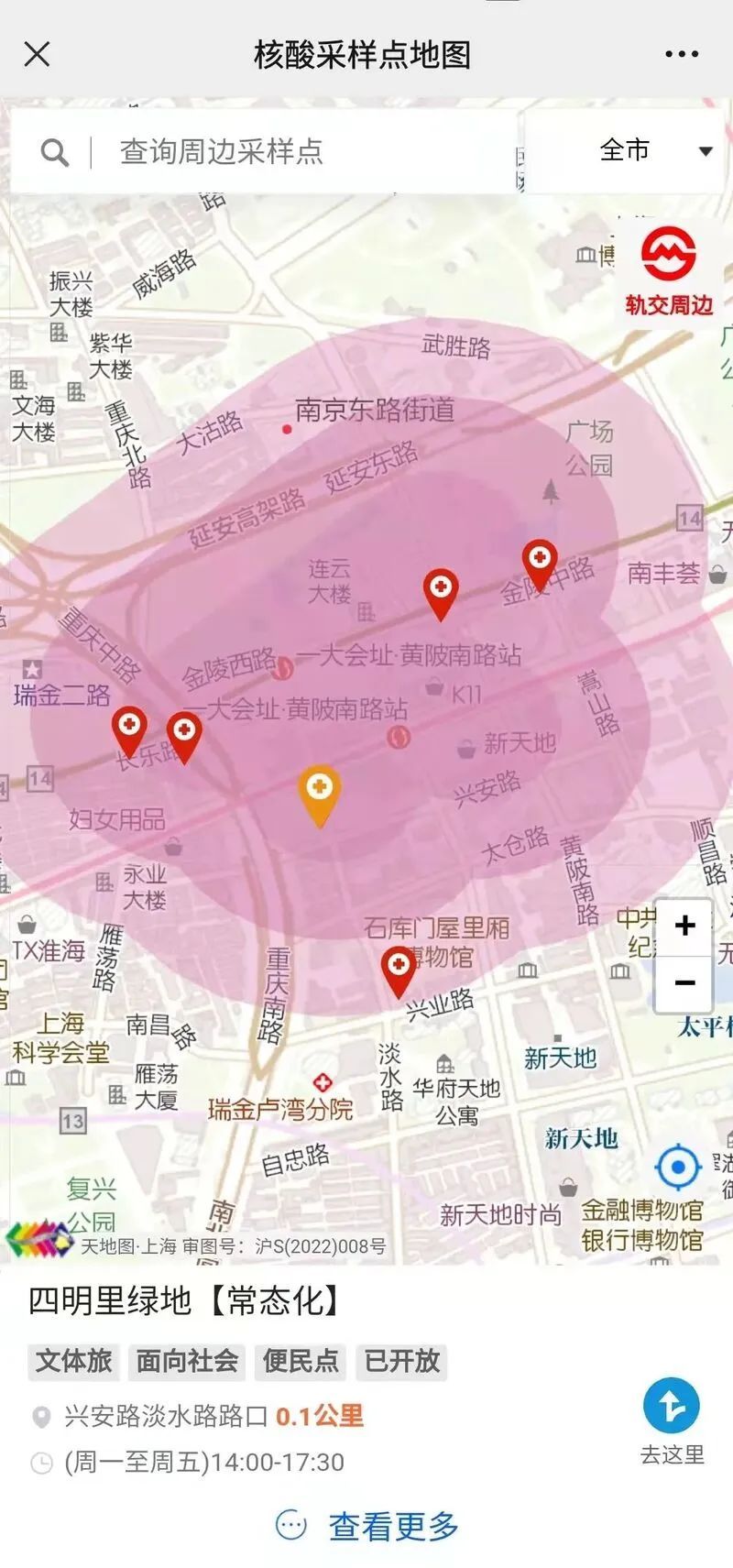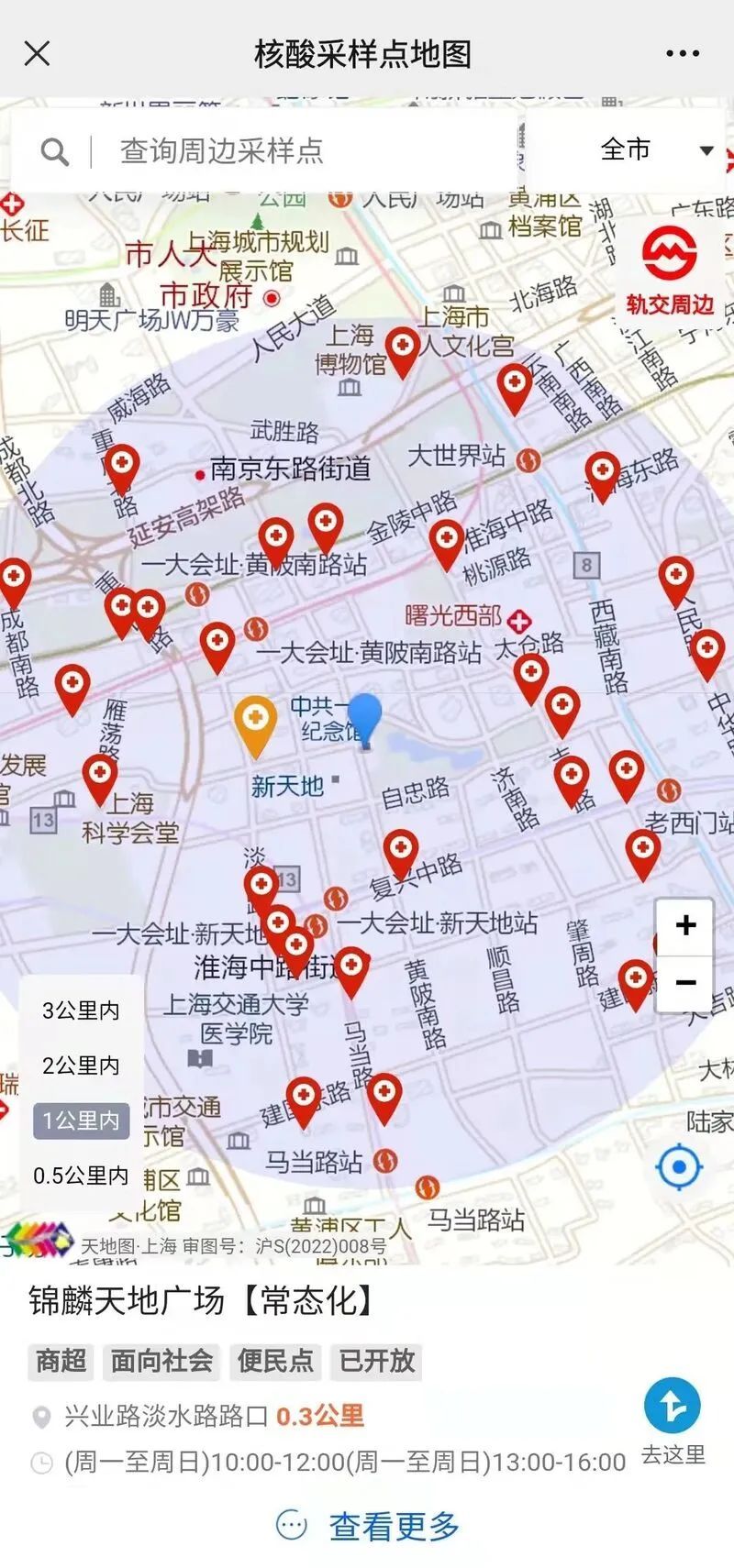 上海市测绘院相关负责人介绍,新版本在地图右侧新增了“轨交周边”按钮,点击可展开各条轨交线路和500多个站点的列表选项,点击某一站点(如“一大会址·黄陂南路”),可直接定位到此处,并展示100米、200米、300米范围的缓冲区和在该范围内的核酸采样点(注:如果轨交站短距离内没有采样点的话将扩大查询范围至1公里、3公里,确保能查询到采样点)。