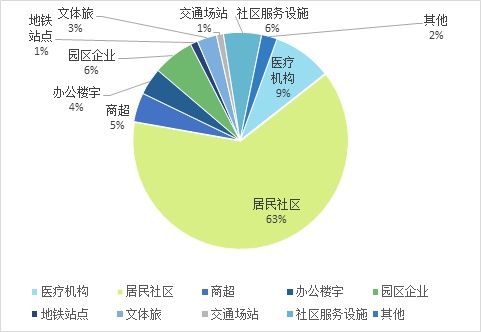从采样点分布的场所来看,63%的采样点布局在居民社区,9%布局在医疗机构,其余分布在社区服务设施、园区企业、办公楼宇、商超等。51%的核酸采样点面向社会公众,45%面向所在小区居民,4%面向特定人群。