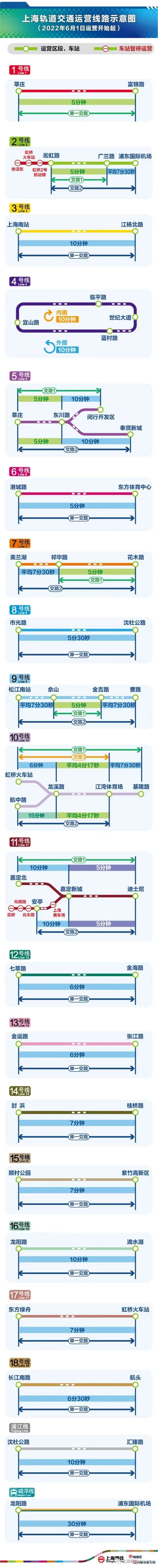 申通地铁集团介绍,自2022年6月1日首班车起,上海轨道交通全网络20条线(除7座车站外)均恢复基本运行。根据计划,6月1日起,上海轨道交通全网络所有线路首末班车时间将恢复至常态水平。需要提醒的是,全网络恢复基本运行的初期阶段,各线路列车最小行车间隔约5至10分钟,较以往有所延长,运营交路也有所调整。同时,将根据客流变化及时增能。详见↓