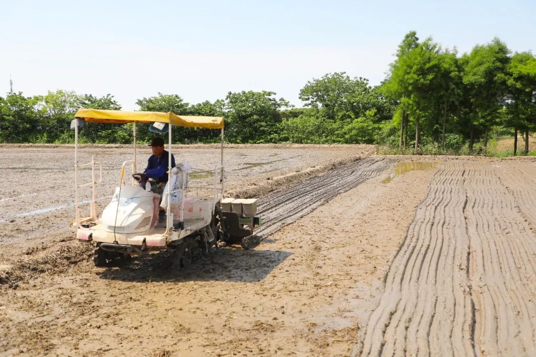 农机手们熟练的转动着方向盘,潇洒穿梭在稻田中,播种机所到之处,快速在田里留下一颗颗稻谷,纵横交错、间隔有序。
