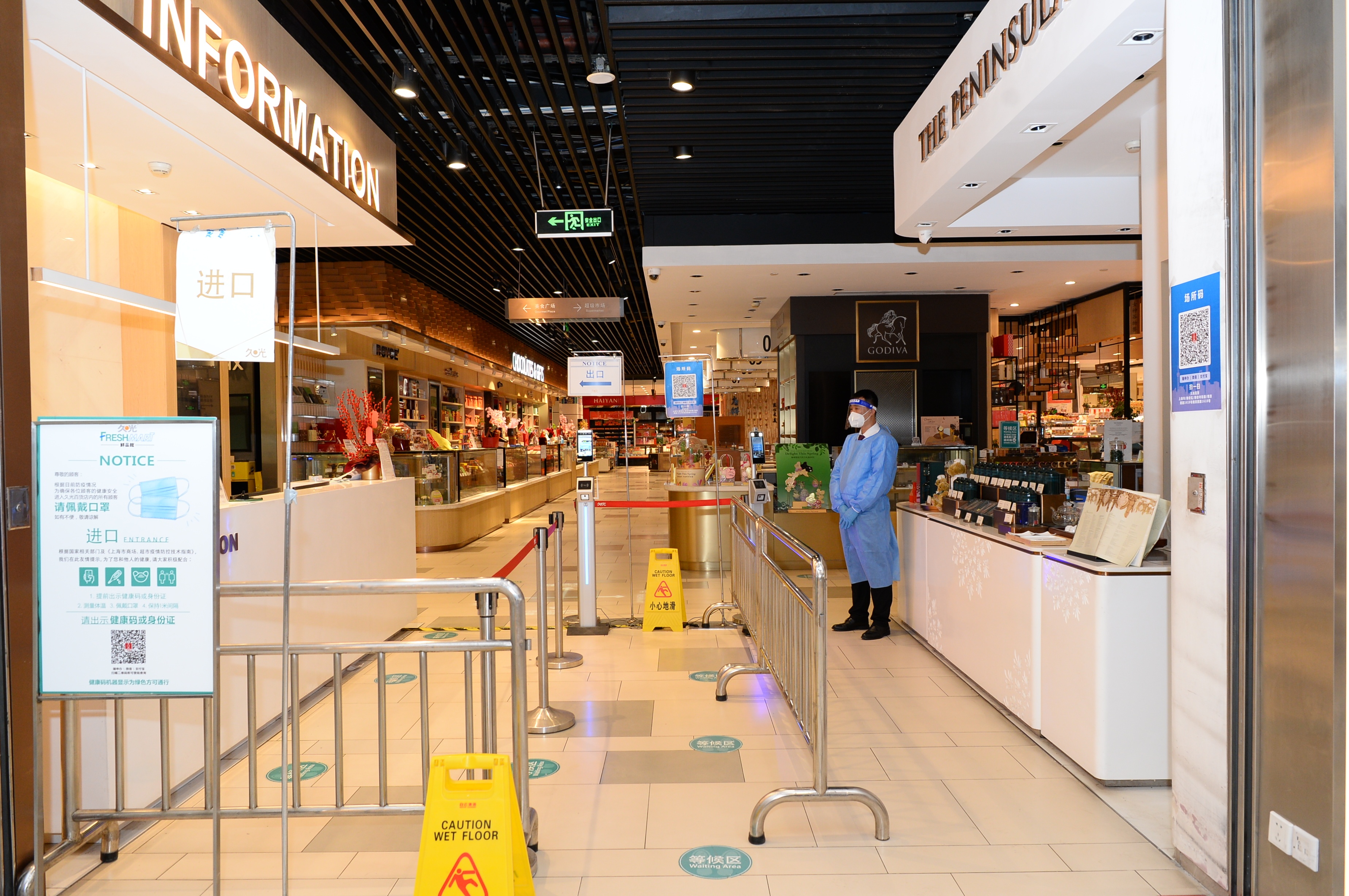 兴业太古汇在各大出入口布置了“场所码”“数字哨兵”,为营业后的客流间隔要求配备了一米栏,确保消费者有序排队入场,商场内的城市超市也已按照平时的三倍量完成备货准备。