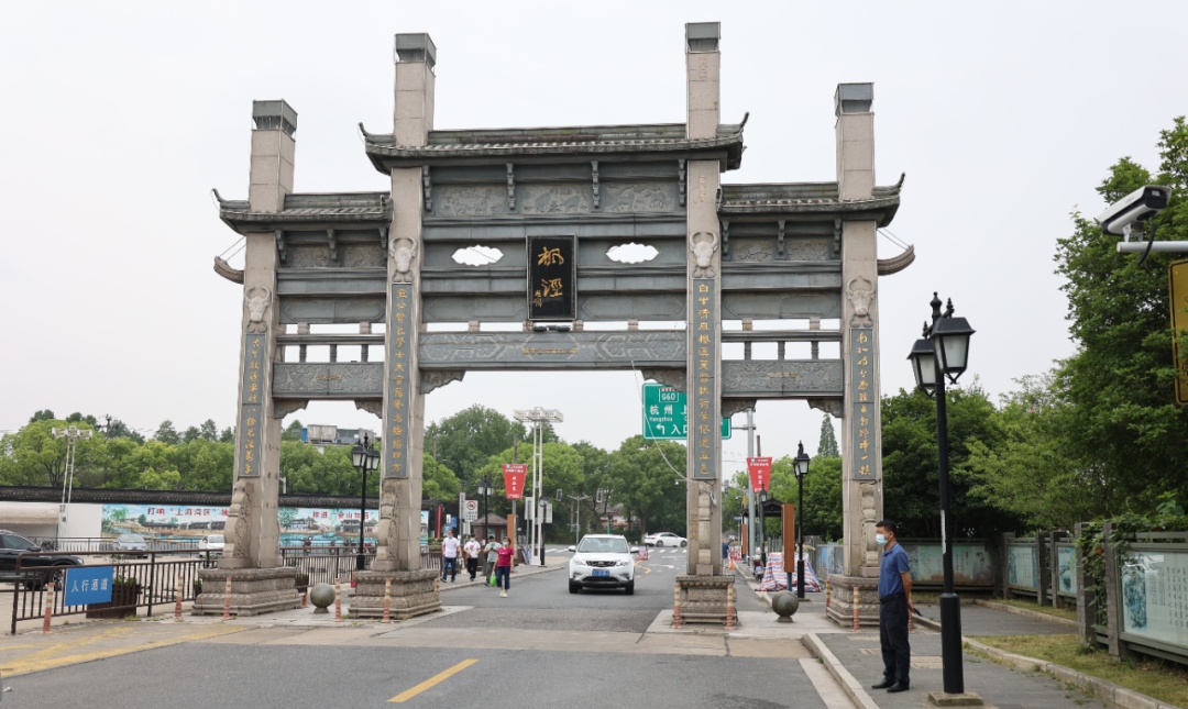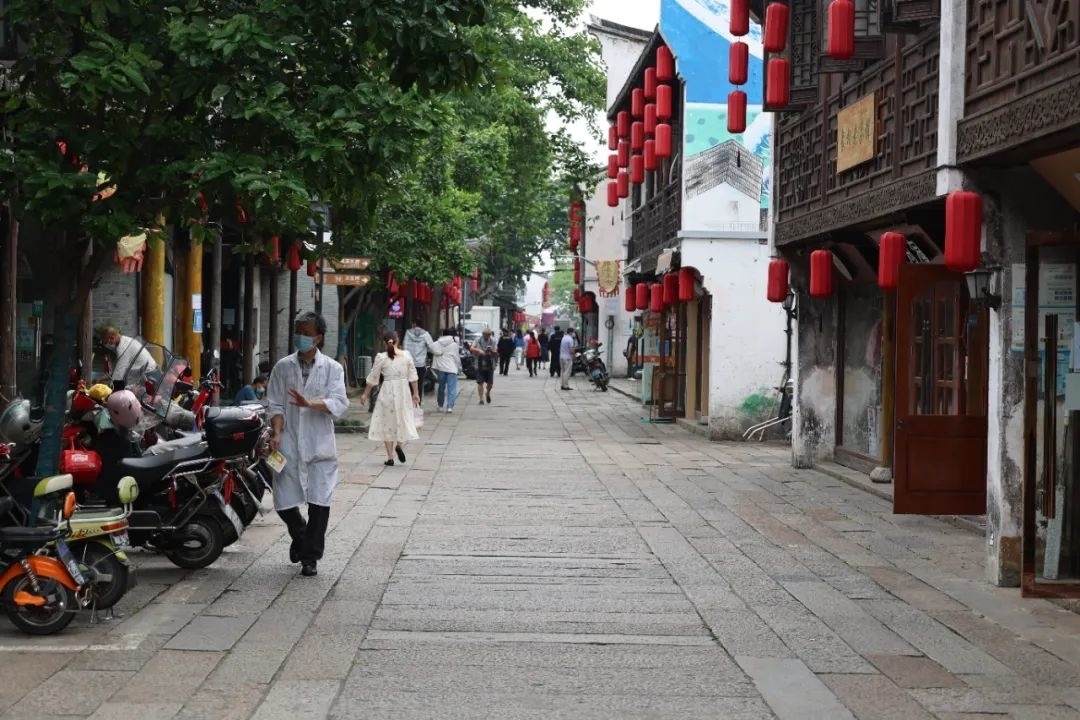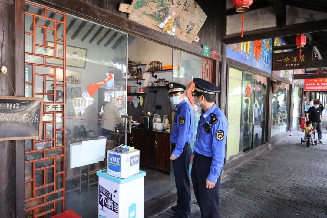 在枫泾古镇中大街,一支由派出所、景区支队、市场监管所等组成的综合执法队伍正在进行巡逻,执法人员对密集人群进行疏散,防止人员聚集。同时要求商家严格履行消杀防控责任,及时提醒进店市民扫码登记。
